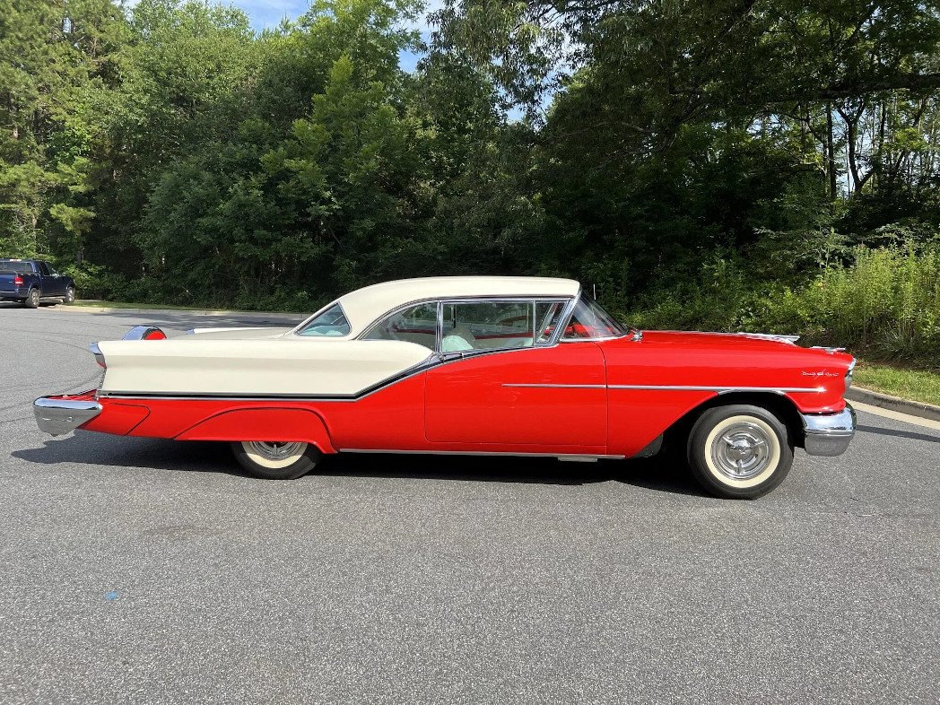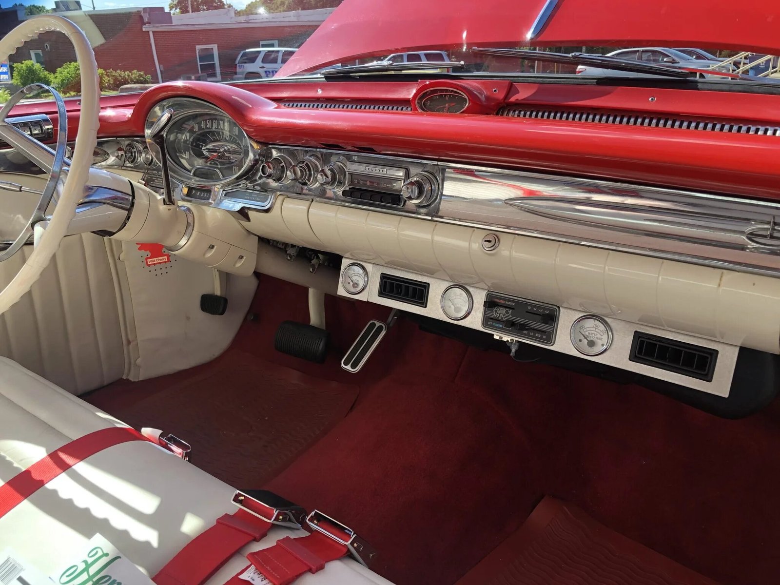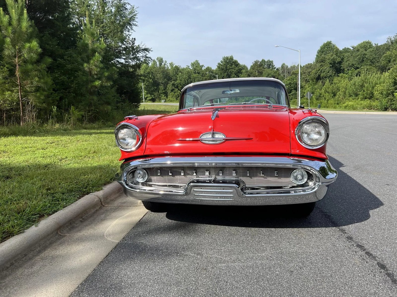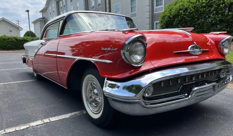 This 1957 Oldsmobile 98 Holiday Coupe is finished in red and white over white vinyl upholstery and powered by a replacement 502ci V8 paired with a Turbo 400 three-speed automatic transmission.