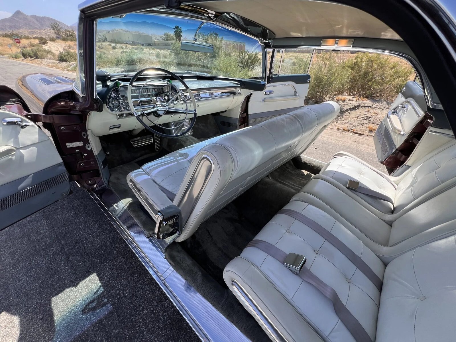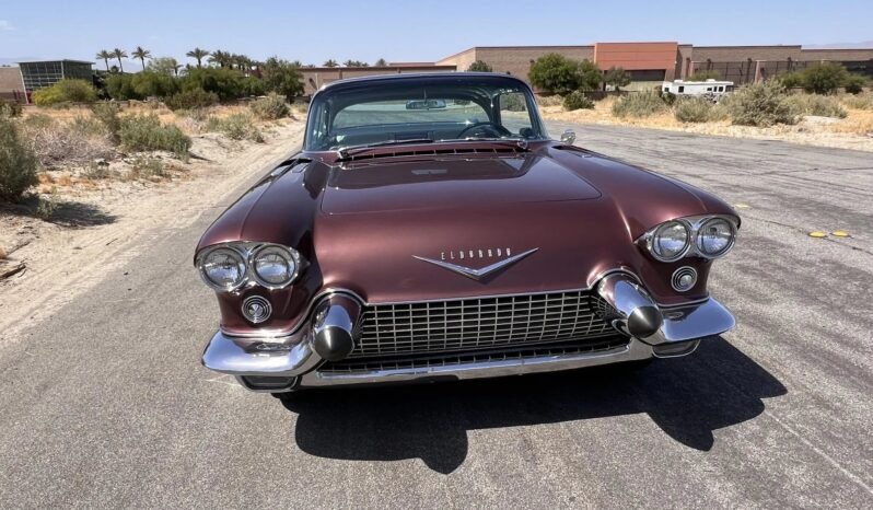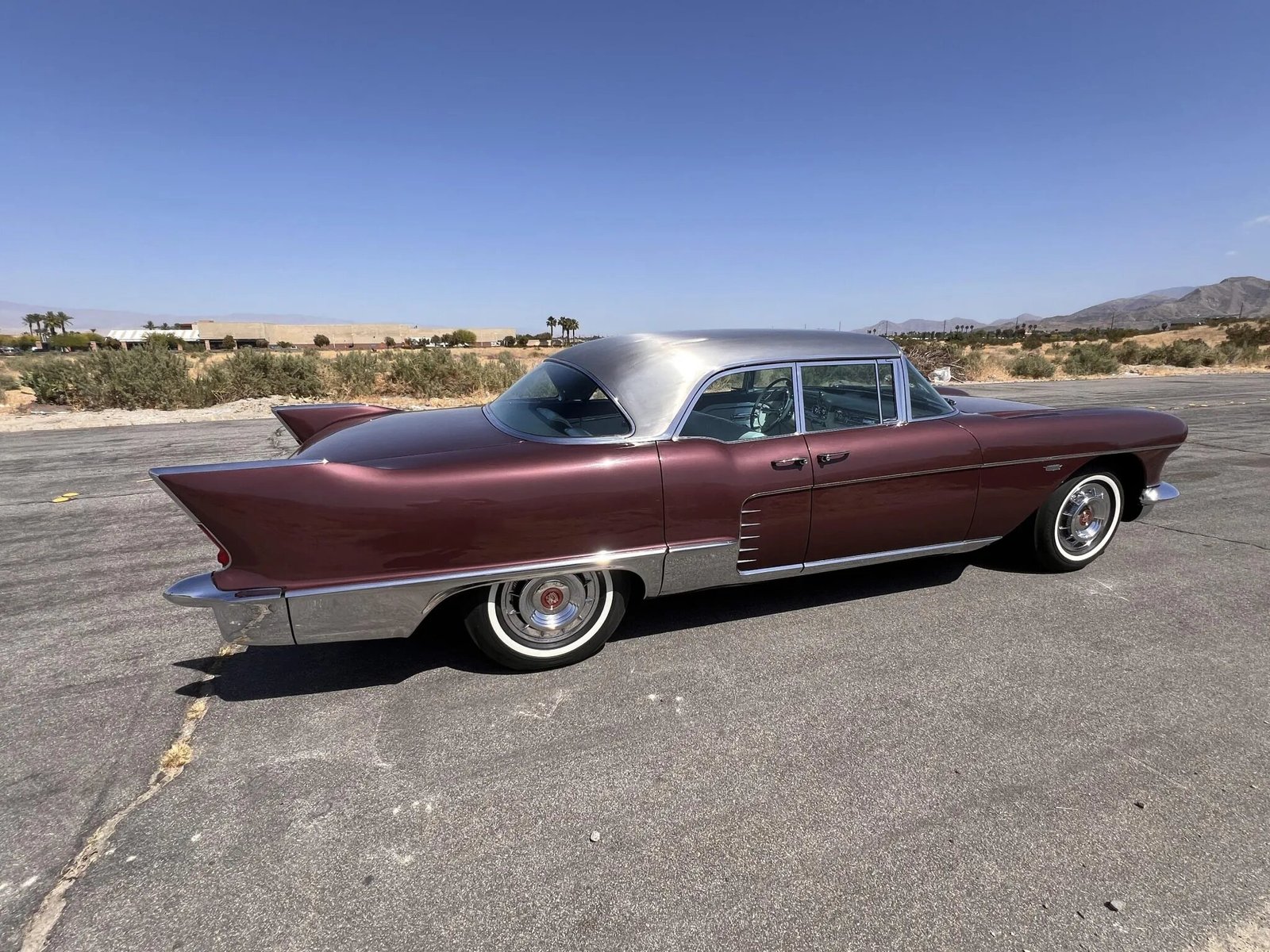 This 1958 Cadillac Eldorado Brougham is one of 304 examples produced for the model year. A mechanical refresh completed in 2017 by Bob Mosier Restorations included a service of the air suspension. The car is finished in maroon over white and gray leather upholstery, and power comes from a 365ci V8 paired with a four-speed automatic transmission. Equipment includes triple two-barrel carburetors, power-assisted four-wheel drum brakes, a brushed stainless steel roof, rear coach doors, power windows, air conditioning, Mouton carpets, and a transistorized AM radio.