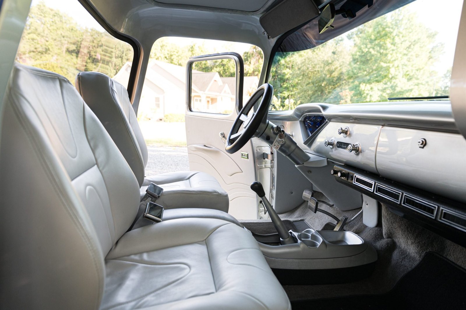 The cabin features metal surfaces painted in Silver Ice along with power-adjustable leather-trimmed bucket seats sourced from a 1991 Silverado.