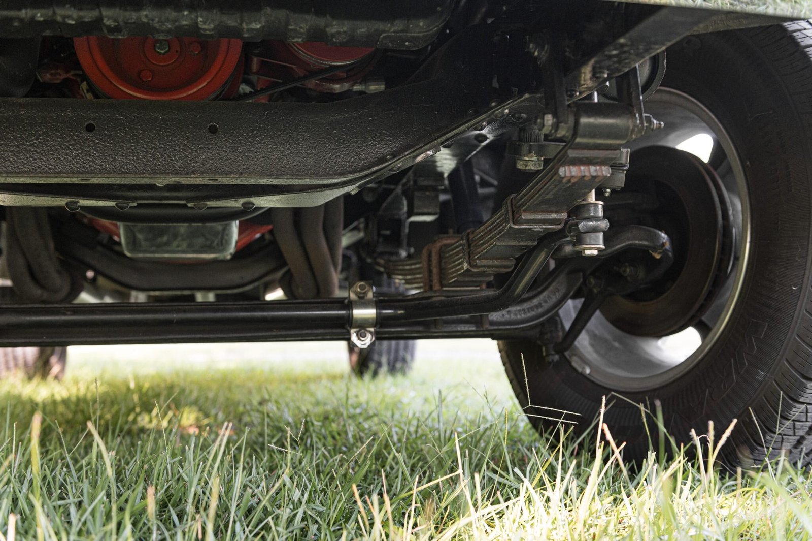 The replacement 350ci V8 is equipped with a four-barrel Edelbrock carburetor, an Edelbrock-branded air cleaner and valve covers, and tubular exhaust headers.