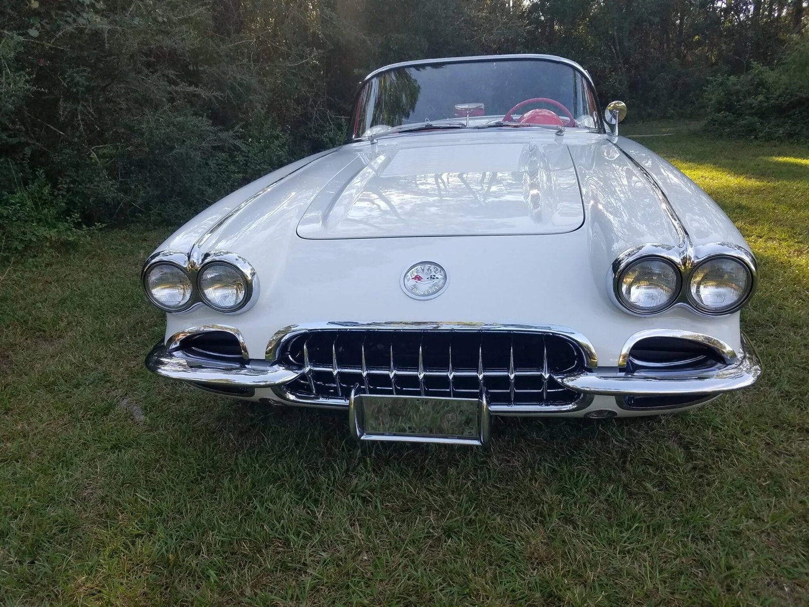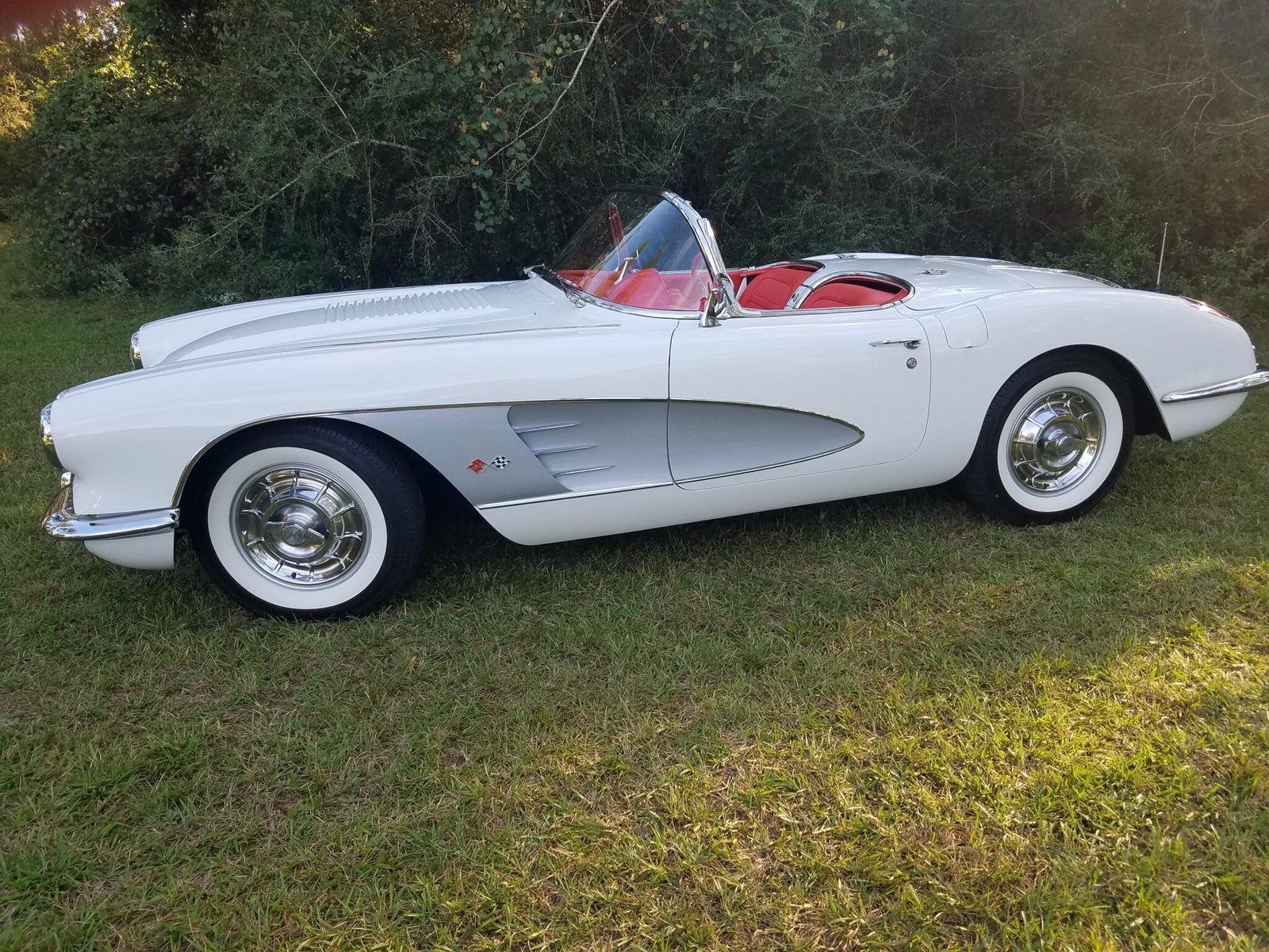 Stress cracks were repaired in the fiberglass body before it was repainted in Snowcrest White with Inca Silver coves, and additional work included replacing the glass.