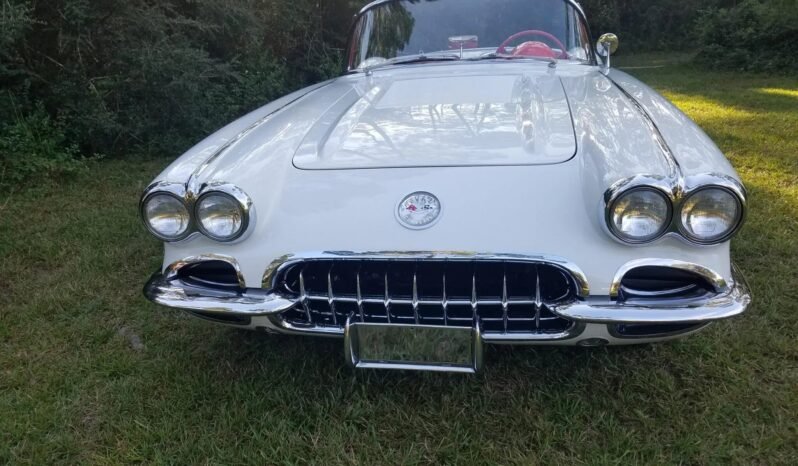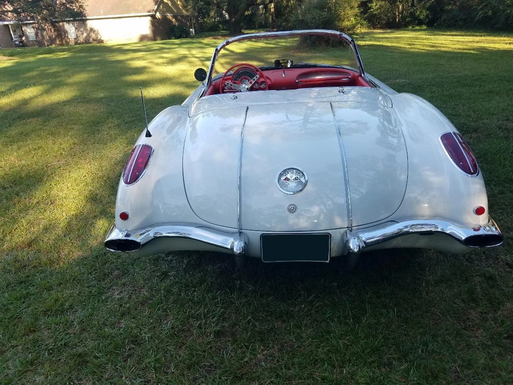 A body-off refurbishment was subsequently performed and included rebuilding the 283ci V8, repainting the exterior in Snowcrest White with silver coves, replacing the window glass and convertible top, replacing the tires, and refreshing the Signet Red interior.