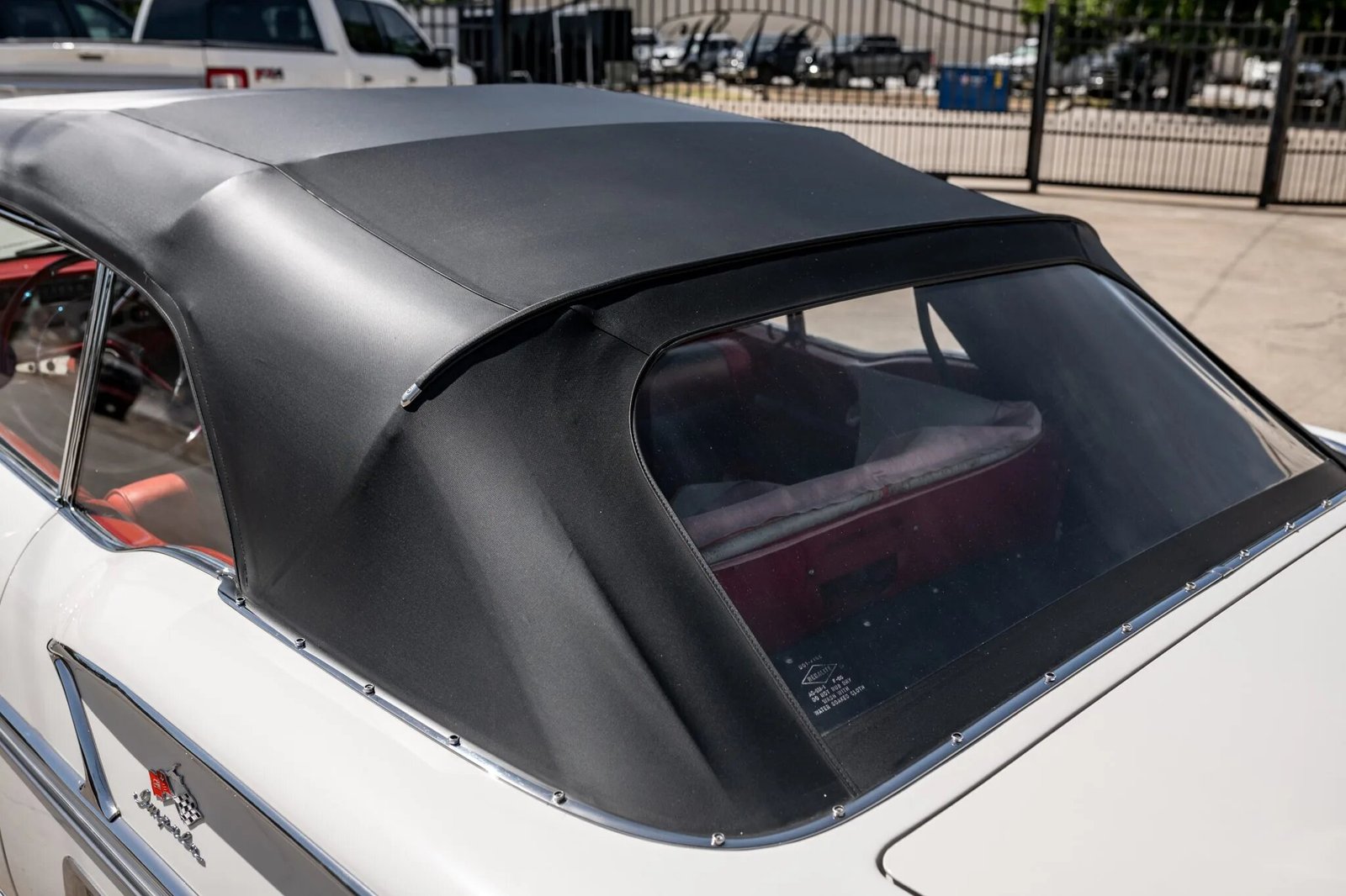 Features include a powered black convertible soft top, a red convertible top boot, a broad grille, wrap-around windshield, quad headlights, a Continental spare tire kit, fender skirts, and chrome body-side trim, faux vents, and bumpers as well as Impala badges, an alcove that houses triple taillights on each side, and a dual outlet exhaust that exits below the rear bumper.