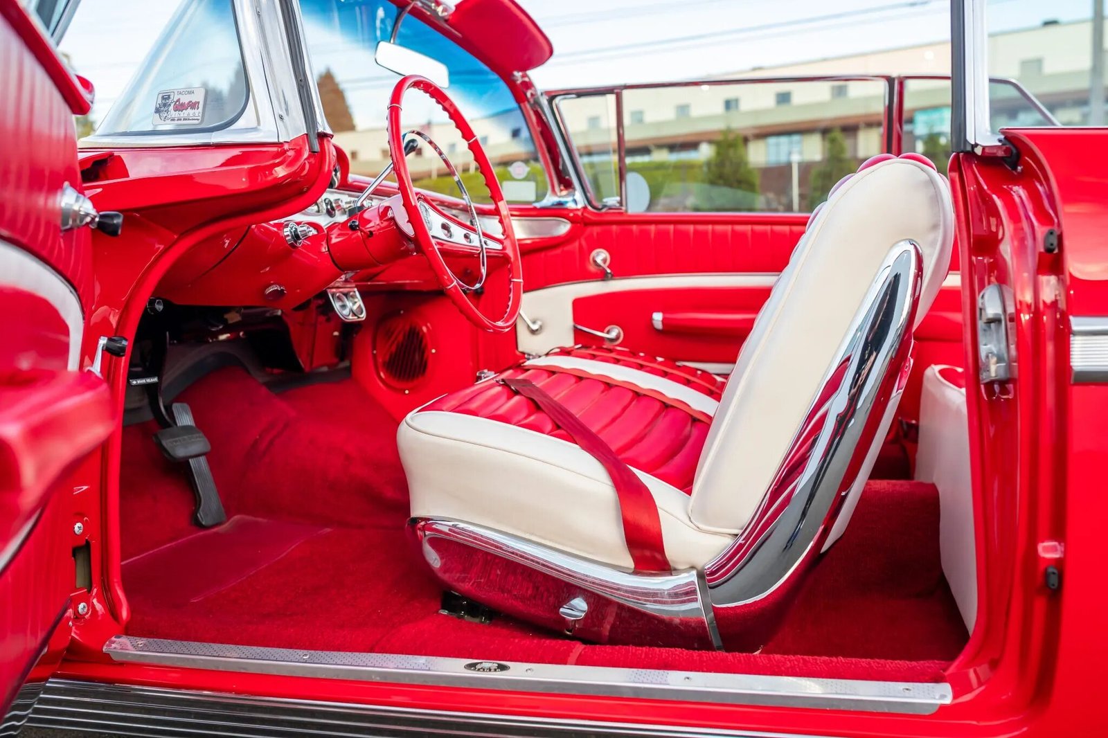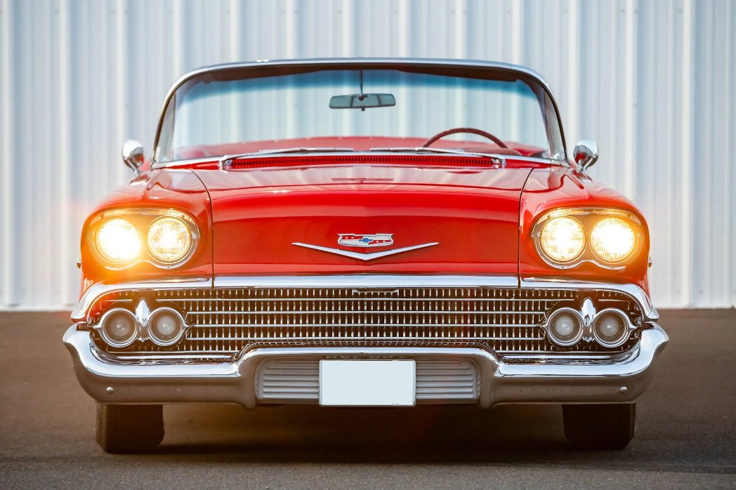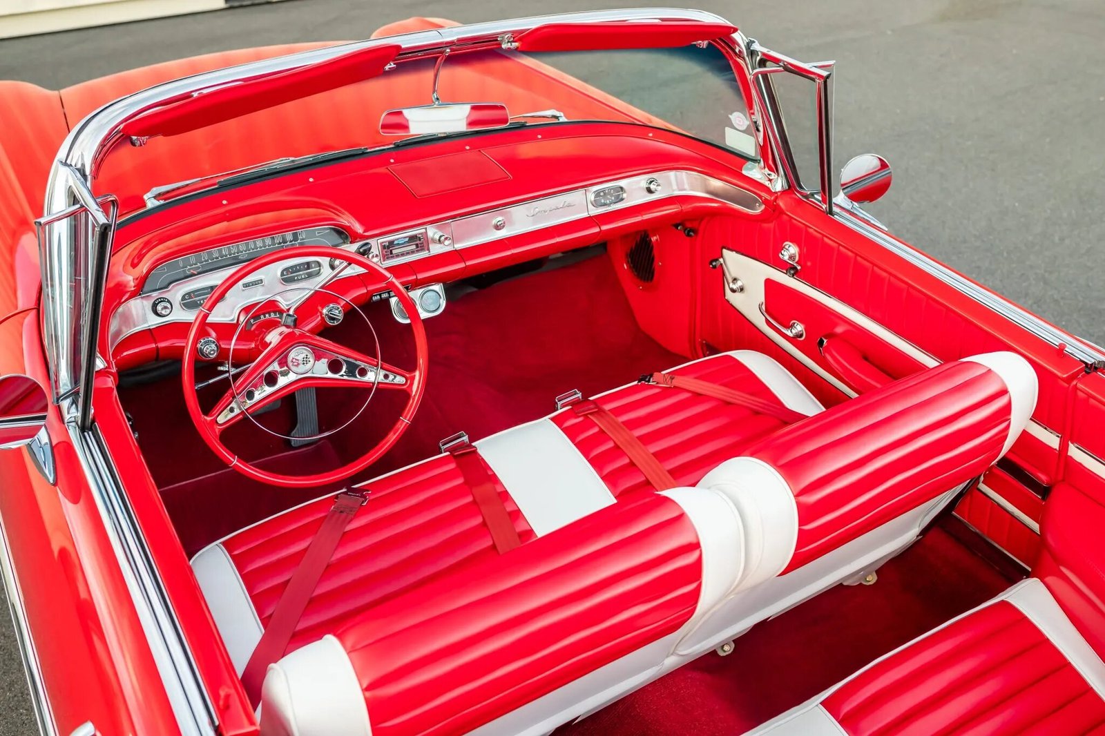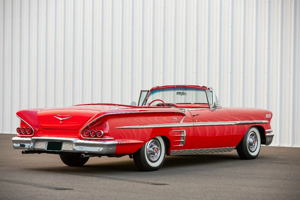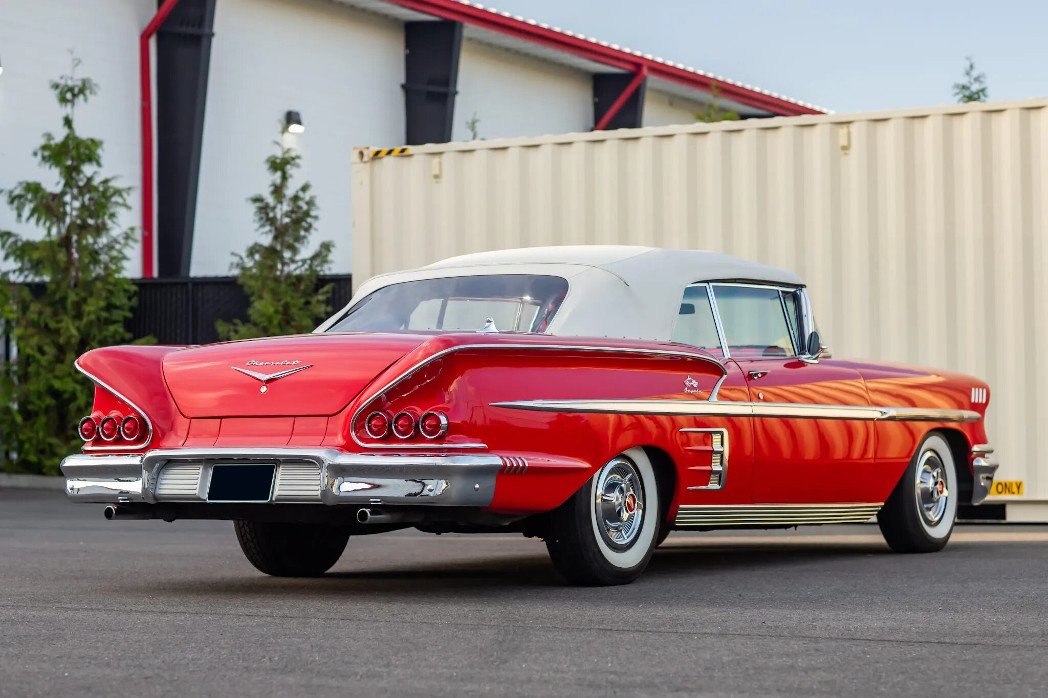 1958 Chevrolet Impala Convertible Red underwent a two-year refurbishment in 1997. Power is provided by a 348ci V8 linked with a TH350 three-speed automatic transmission, and the car is finished in red over red and white vinyl upholstery. Equipment includes tri-power induction, a power-operated white convertible top, a red parade boot, power steering, power drum brakes, 14″ steel wheels, an electric clock, a digital cassette stereo, and a dual exhaust system. Work in preparation for sale consisted of replacing the power steering control valve and cylinder, rear brake hardware and shoes, and oil pan and valve cover gaskets.
