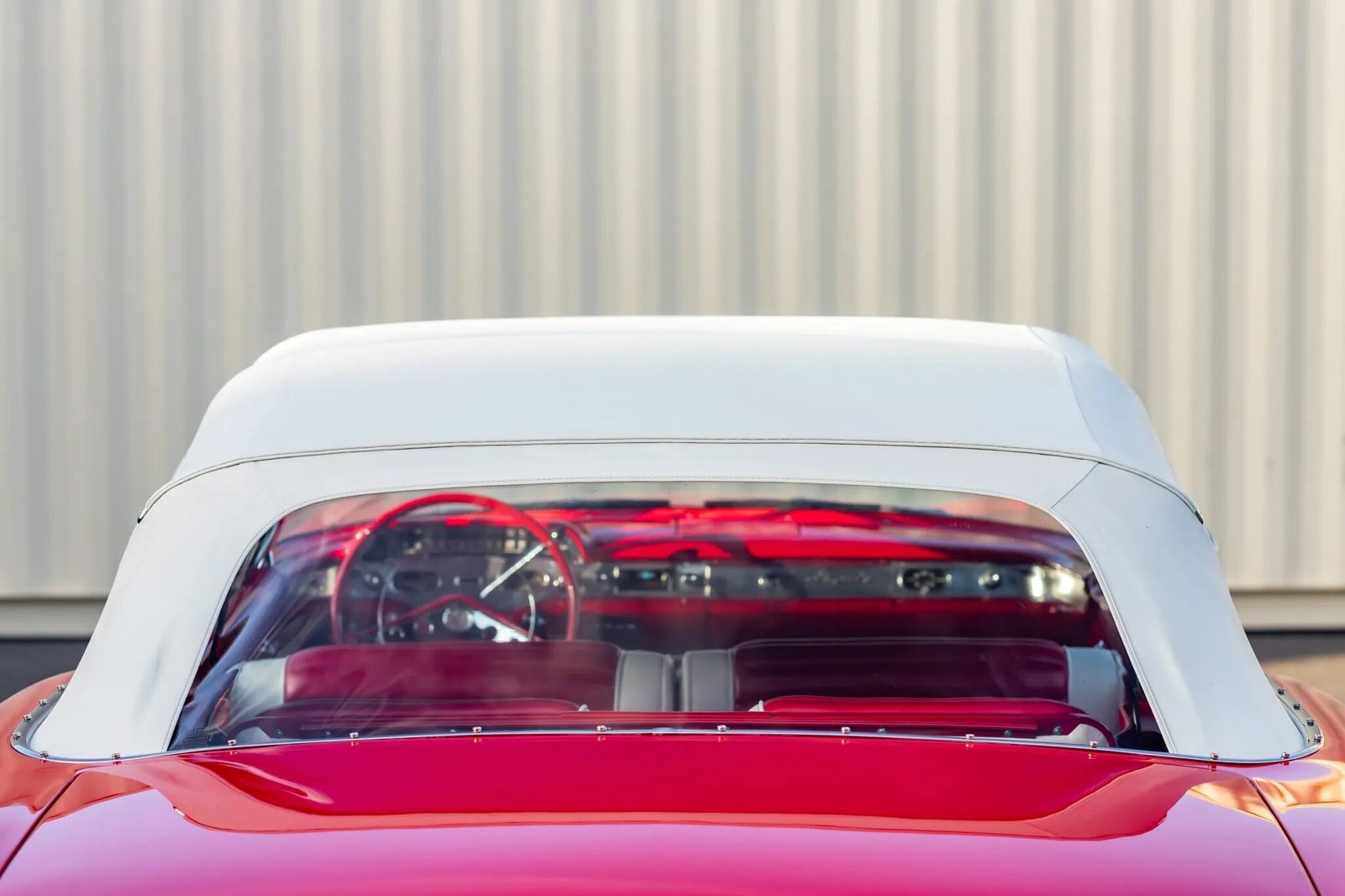 The car left the factory finished in Snowcrest White (936) and was repainted in its current shade of red during the 1997 refurbishment. Details include a power-operated white convertible top, a red parade boot, a wrap-around windshield, quad headlights, and chrome body-side trim, bumpers, and faux vents as well as a rear alcove that houses triple taillights on each side.