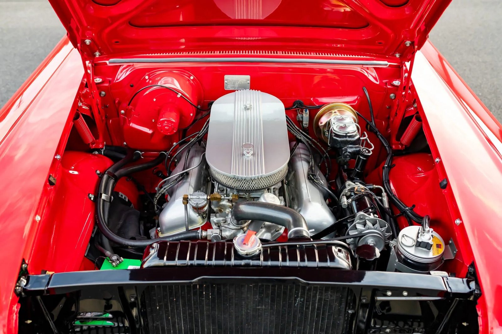 The 348ci V8 have been rebuilt during the refurbishment and is topped with triple two-barrel carburetors and a finned air cleaner assembly. The oil pan and valve cover gaskets were replaced, and an oil change was performed in preparation for the sale.