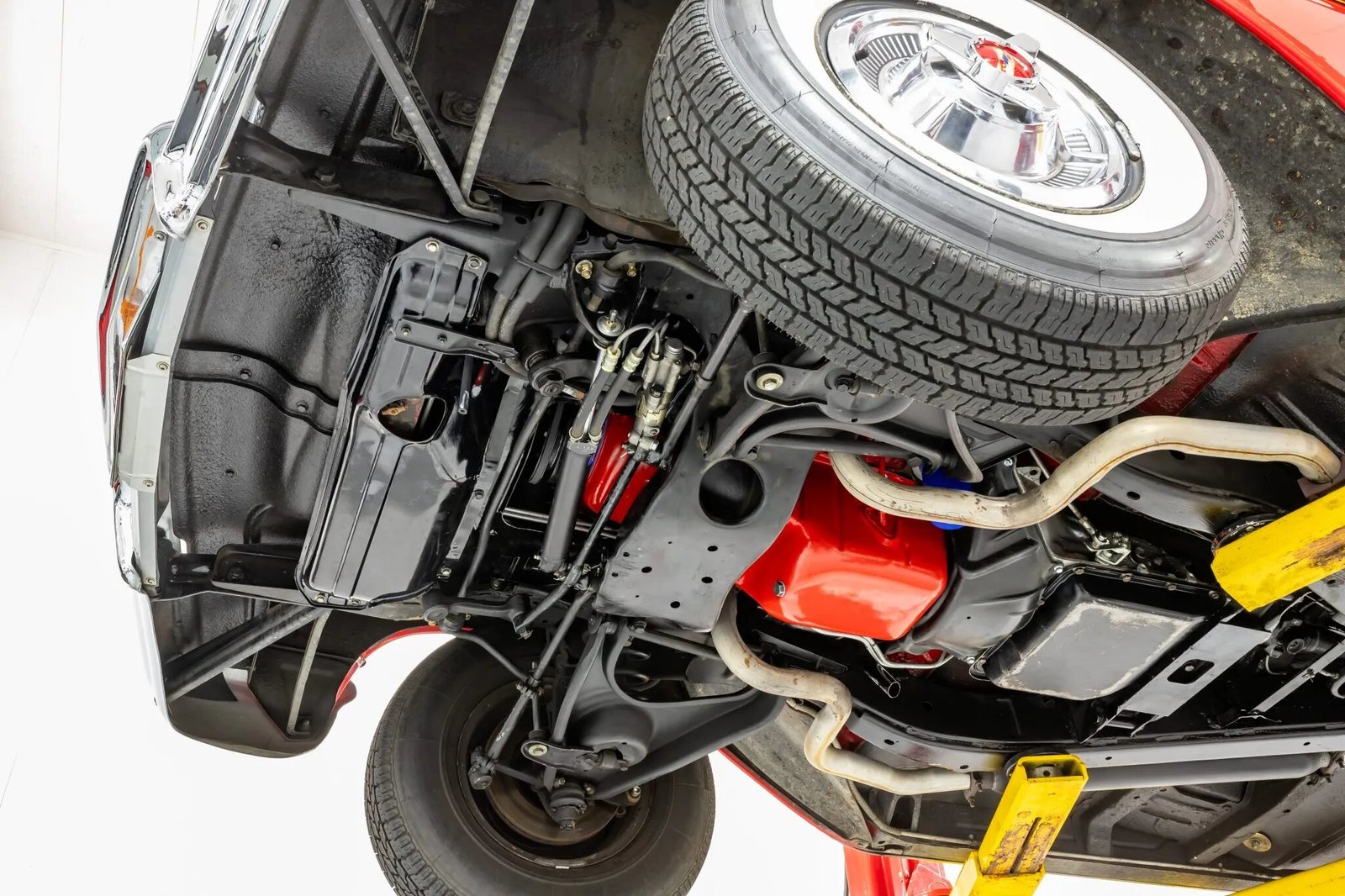 Power is sent to the rear wheels via a TH350 three-speed automatic transmission. A replacement dual exhaust system with bullet-style mufflers has been installed.