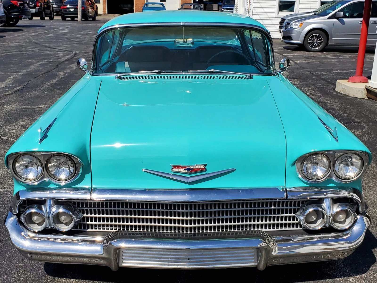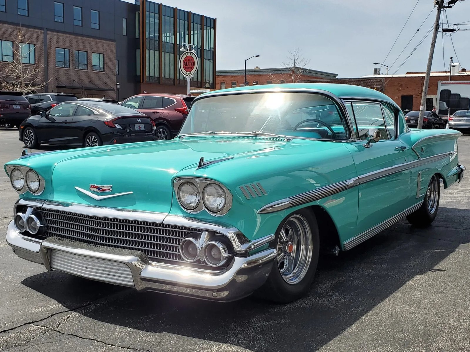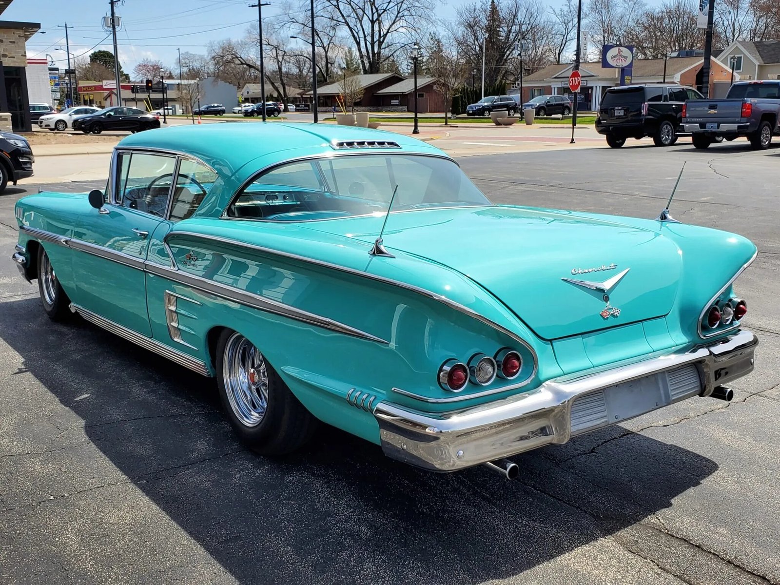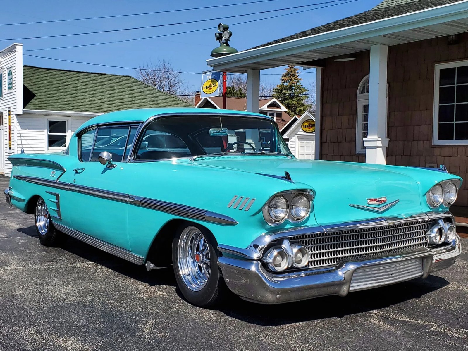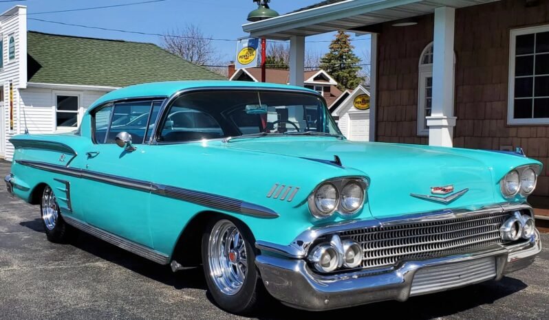 This 1958 Chevrolet Impala is a two-door Sport Coupe powered by a replacement 348ci Turbo Thrust V8 with Tri-Power induction paired with a three-speed manual transmission.