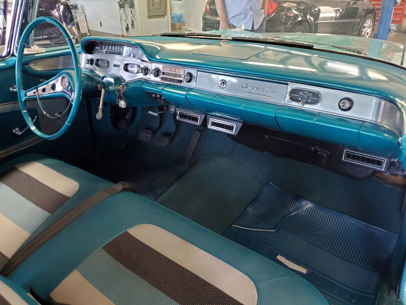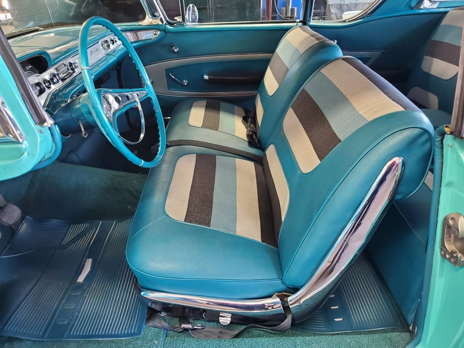 The car is finished in turquoise over blue and patterned cloth upholstery, and additional features include 15″ five-spoke wheels, chrome trim, quad headlamps, a curved windshield and back glass, and bench seating.