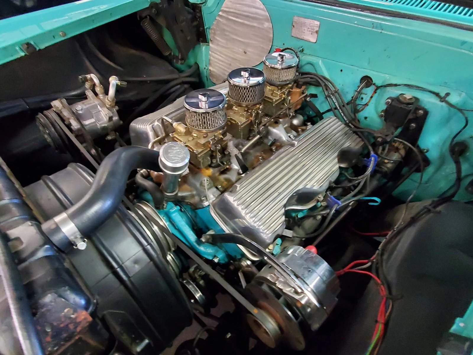 The 348ci Turbo Thrust V8 was sourced from a 1959 Chevrolet and is equipped with a Tri-Power intake manifold and three two-barrel carburetors.