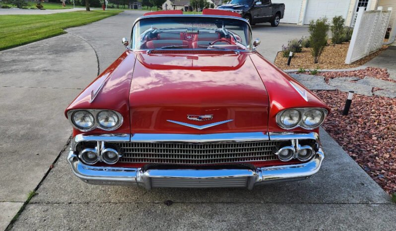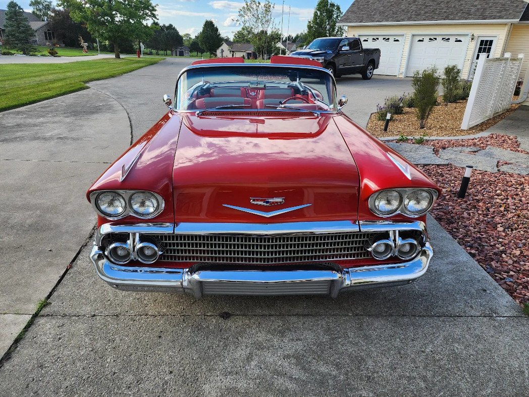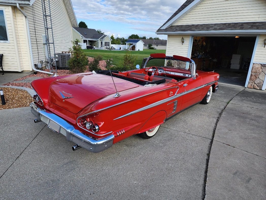 This 1958 Chevrolet Impala convertible was refurbished, power is provided by 348ci Turbo Thrust V8 fitted with triple two-barrel carburetors and linked with a Powerglide two-speed automatic transmission. The car was refinished in red over red and tri-tone upholstery during the refurbishment. Equipment includes a power-operated white soft top, rear fender skirts, dual rear antennas, power steering, power front disc brakes, spinner-style wheel covers, power windows, and a dual exhaust system.