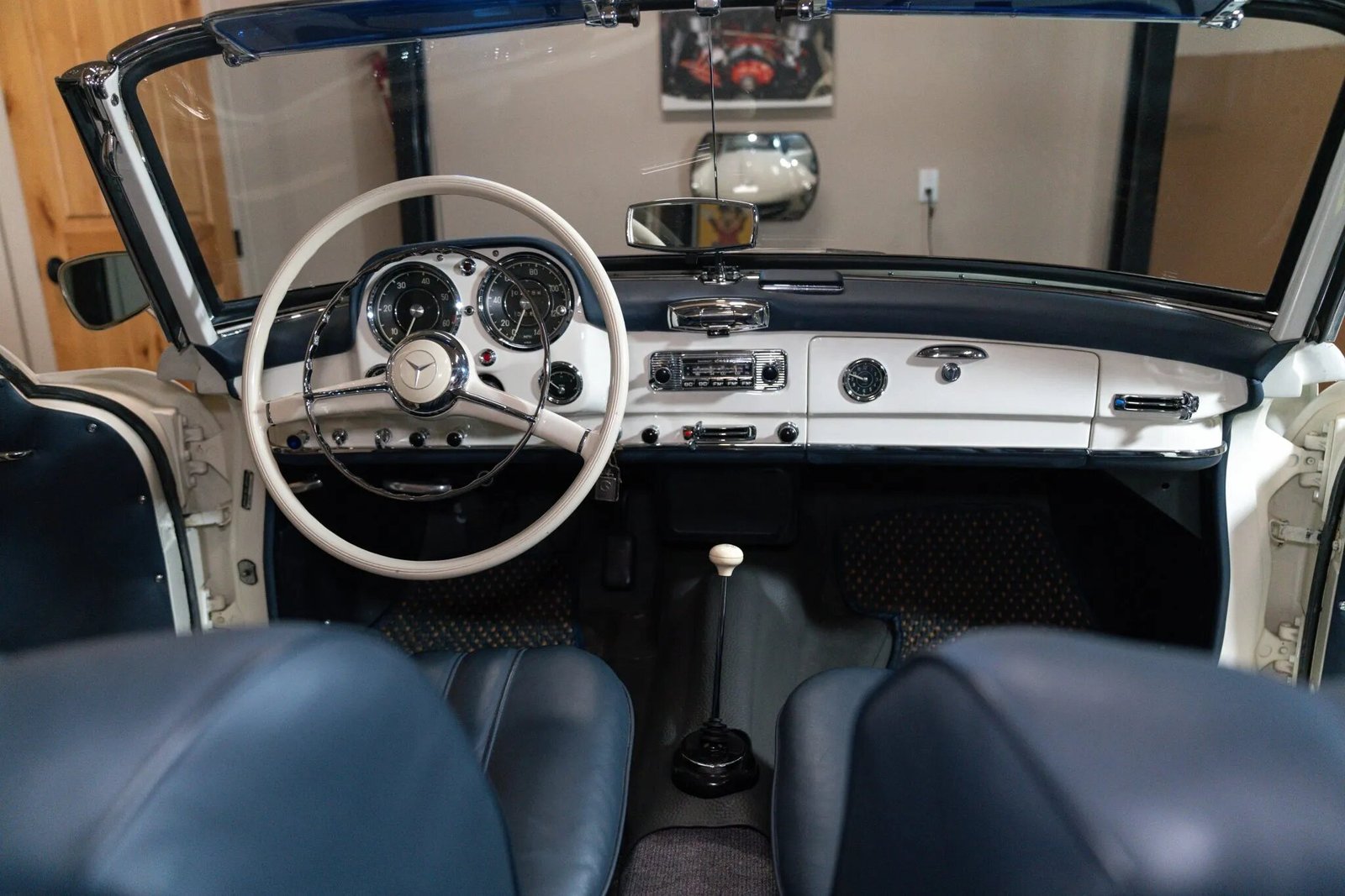 The cabin was stripped and reupholstered and features low-back bucket seats trimmed in blue leather as well as matching door panels and dashboard trim. Amenities include lap belts, an analog clock, a Becker Europa AM/FM radio, and a dashboard-mounted rearview mirror.