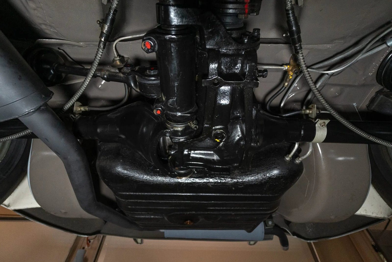 Steel 13″ wheels wear chrome trim rings, hubcaps with body-color accents, and Vredestein Sport Classic V wide whitewall tires. The car is equipped with a double-wishbone front suspension, rear swing axles with coil springs, and power-assisted drum brakes. The shocks, tie rods, bushings, and brake master cylinder were replaced during the refurbishment.