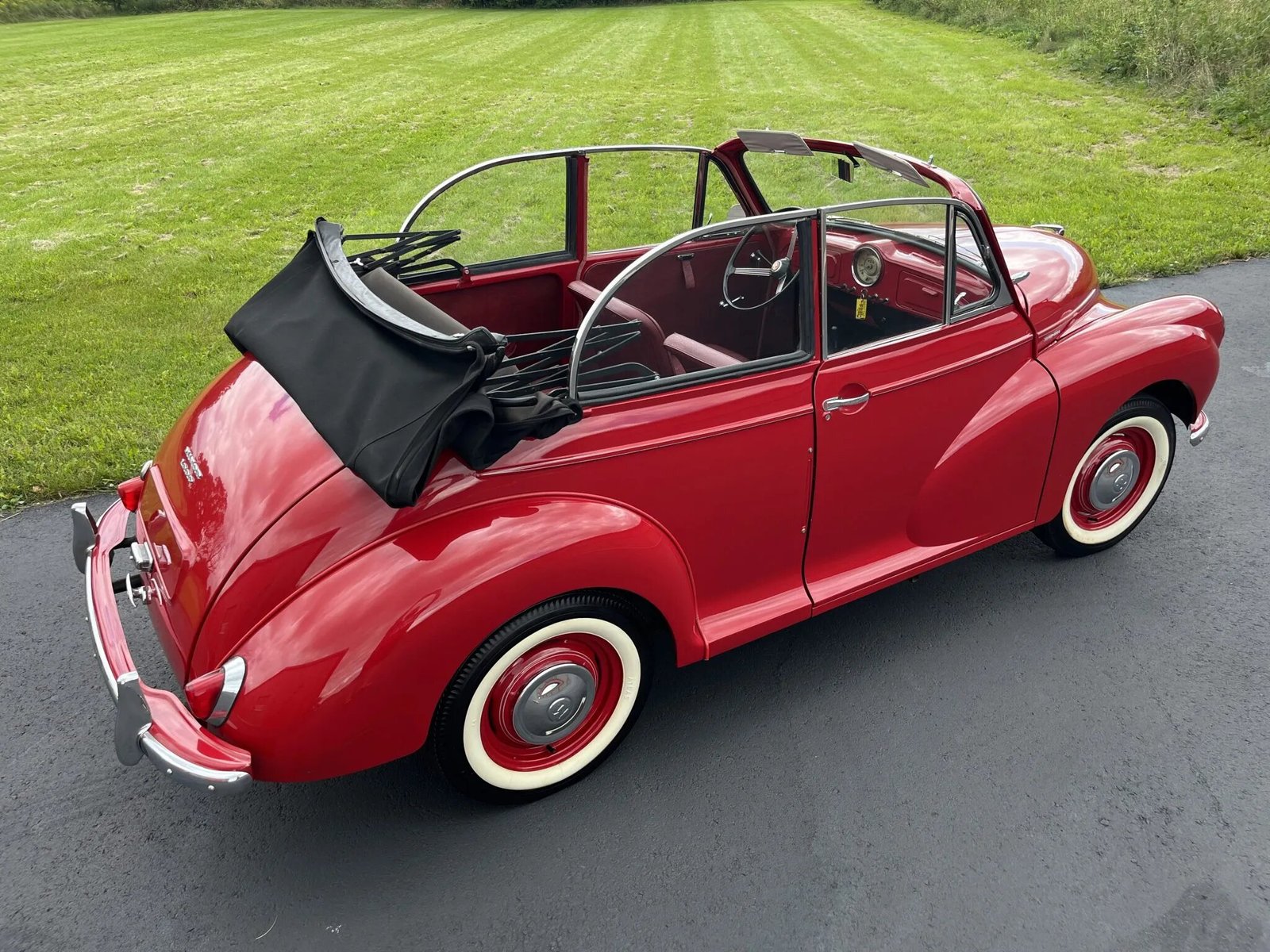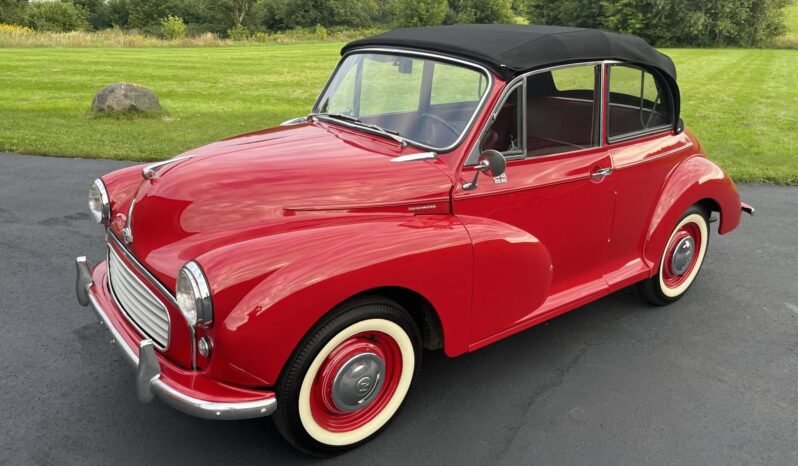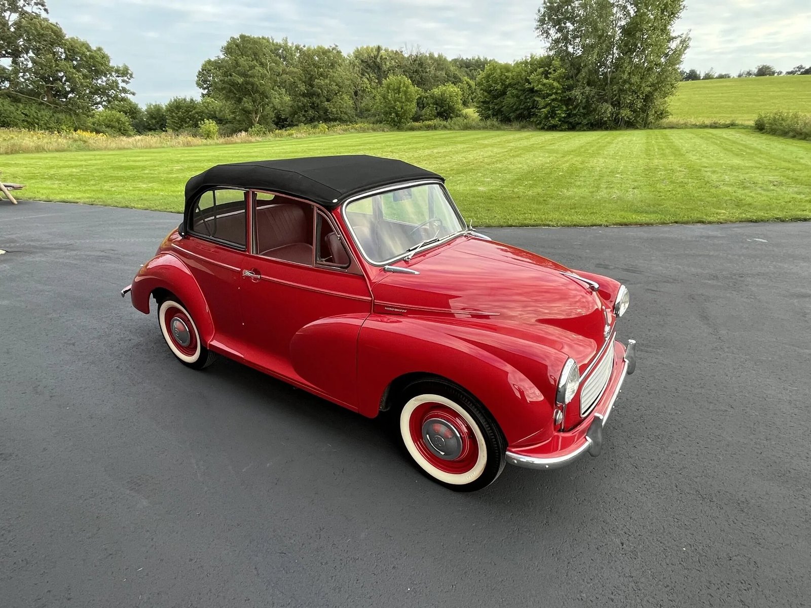 This 1958 Morris Minor 1000 Tourer is a two-door convertible, it is finished in red over matching vinyl upholstery and is powered by a 948cc inline-four mated to a four-speed manual transmission. Additional equipment includes dual SU carburetors, a black convertible top, body-color steel wheels, chrome bumpers with overriders, and lap belts.