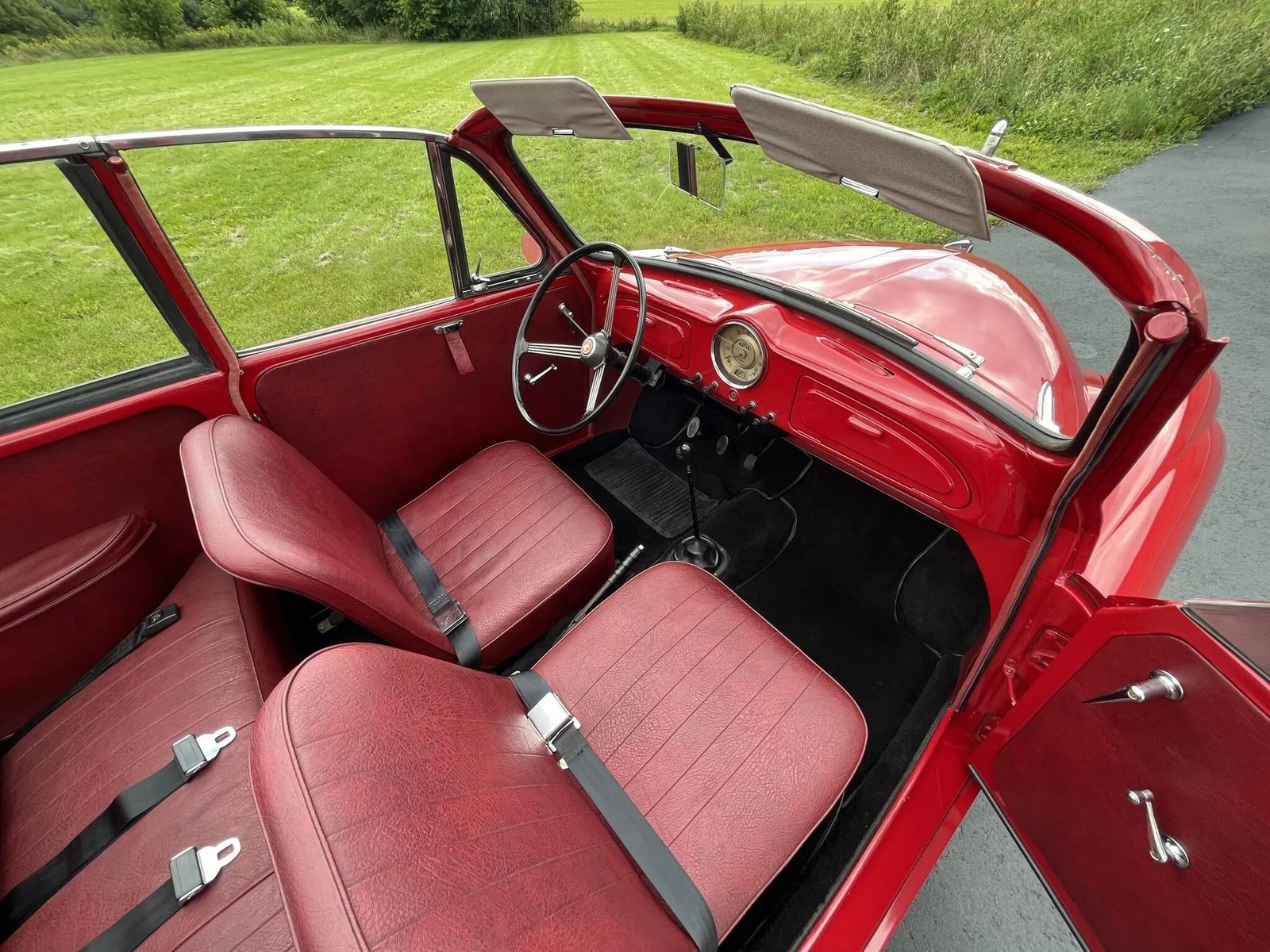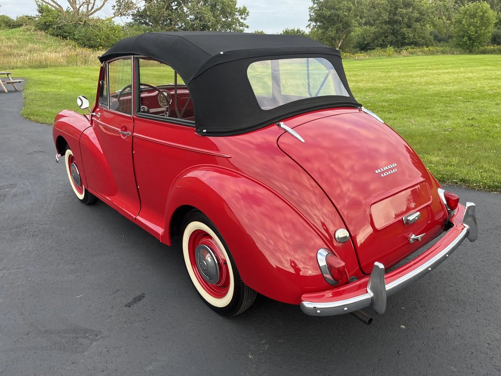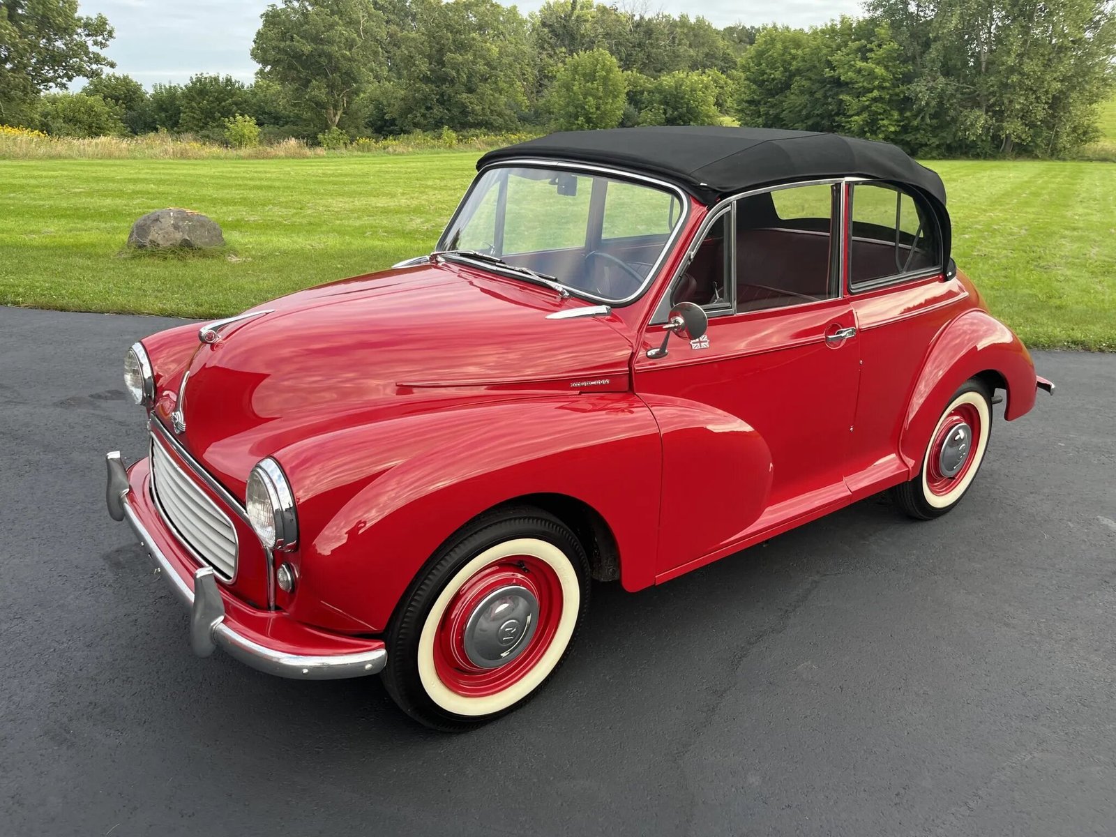 This 1958 Morris Minor 1000 Tourer is a two-door convertible, it is finished in red over matching vinyl upholstery and is powered by a 948cc inline-four mated to a four-speed manual transmission. Additional equipment includes dual SU carburetors, a black convertible top, body-color steel wheels, chrome bumpers with overriders, and lap belts.