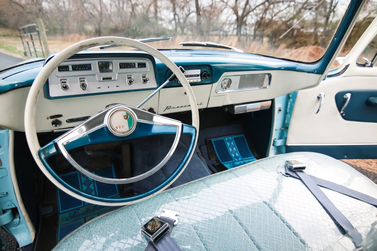 The dashboard and door panels are trimmed in blue and white, and amenities include front and rear vent windows, front lap belts, Studebaker-branded rubber floor mats, an analog clock, a Climatizer heater, a disconnected push-button radio, and an aftermarket AM/FM cassette player mounted inside the glove compartment.