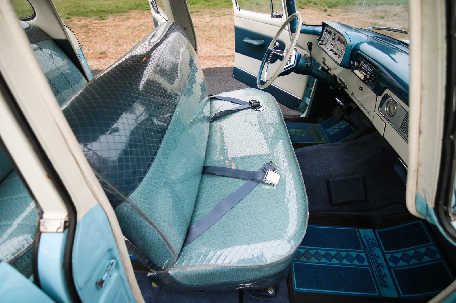 The cabin features front and rear bench seats trimmed in two-tone blue upholstery under clear plastic covers.