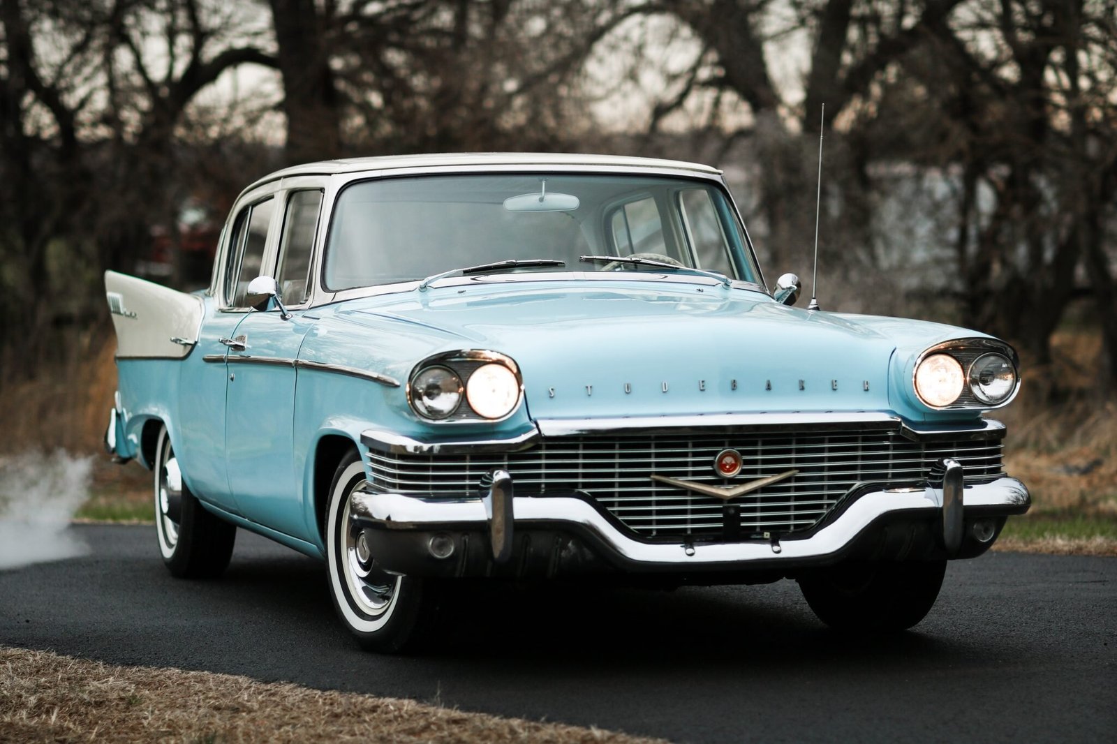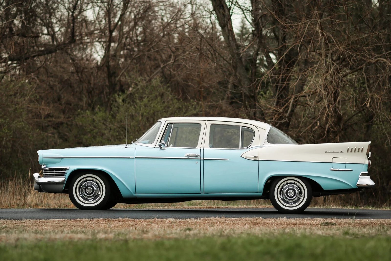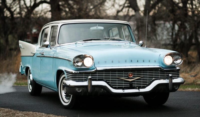 This 1958 Studebaker President Sedan is finished in two-tone blue and white over multi-tone upholstery and is powered by a 289ci Sweepstakes V8 mated to a three-speed Flight-O-Matic automatic transmission and a Twin-Traction differential. Equipment includes white 14″ steel wheels with covers, a stainless-steel exhaust system, dual side mirrors, a Climatizer heater, and an aftermarket AM/FM cassette player.