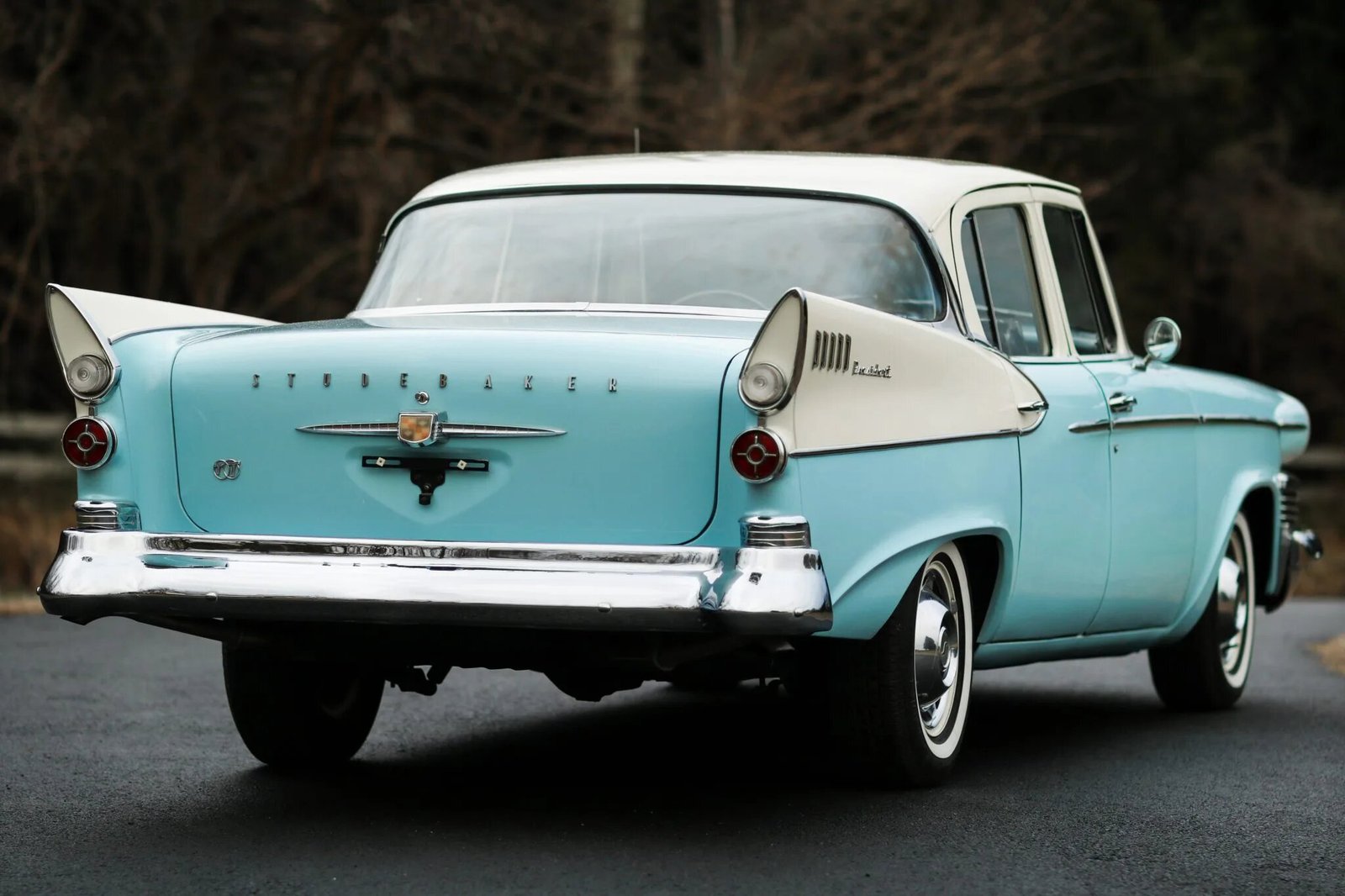 Features include quad headlights, dual side mirrors, bright trim, chrome bumpers, a wrap-around rear window, and tail fins.