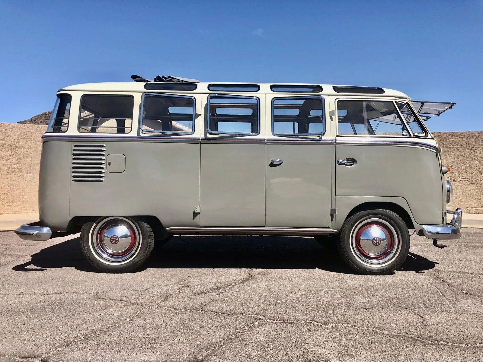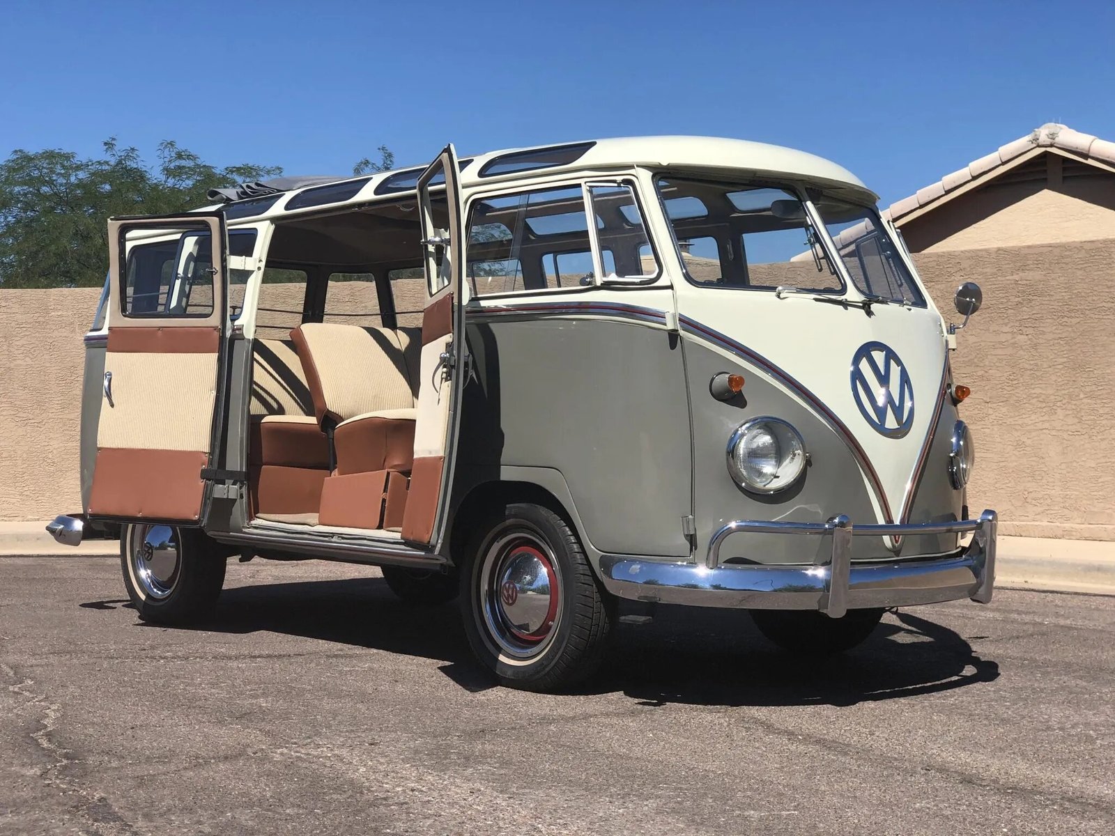 This 1958 Volkswagen Type 2 is a 23-window Deluxe model was refurbished between 2012 and 2019. It is finished in two-tone gray and cream over a brown and tan interior and powered by a replacement dual-port 1.6L flat-four mated to a four-speed manual transaxle. Equipment includes a sliding fabric sunroof, safari-style windshields, 15″ steel wheels, chrome bumpers, and a Motorola radio.