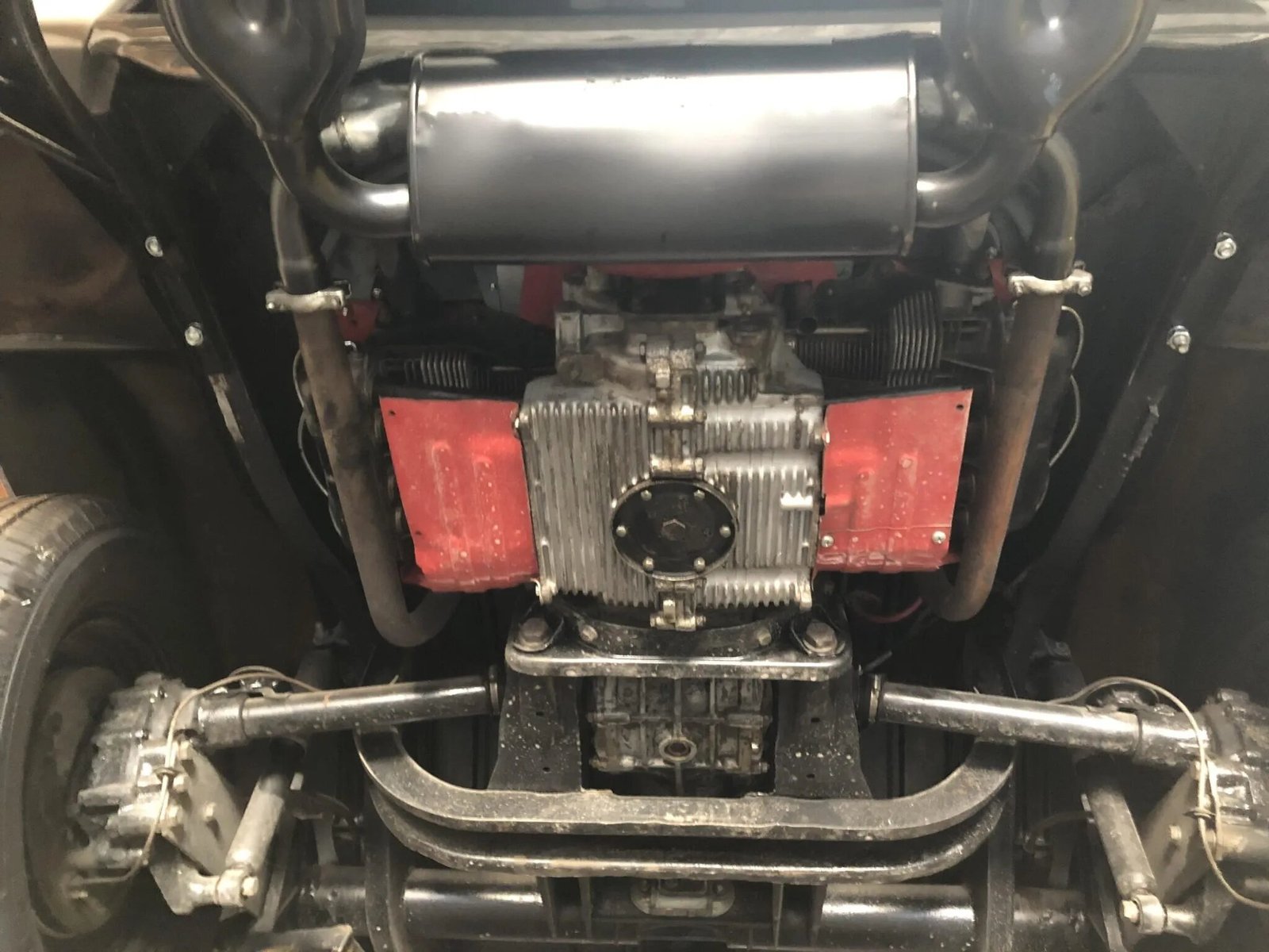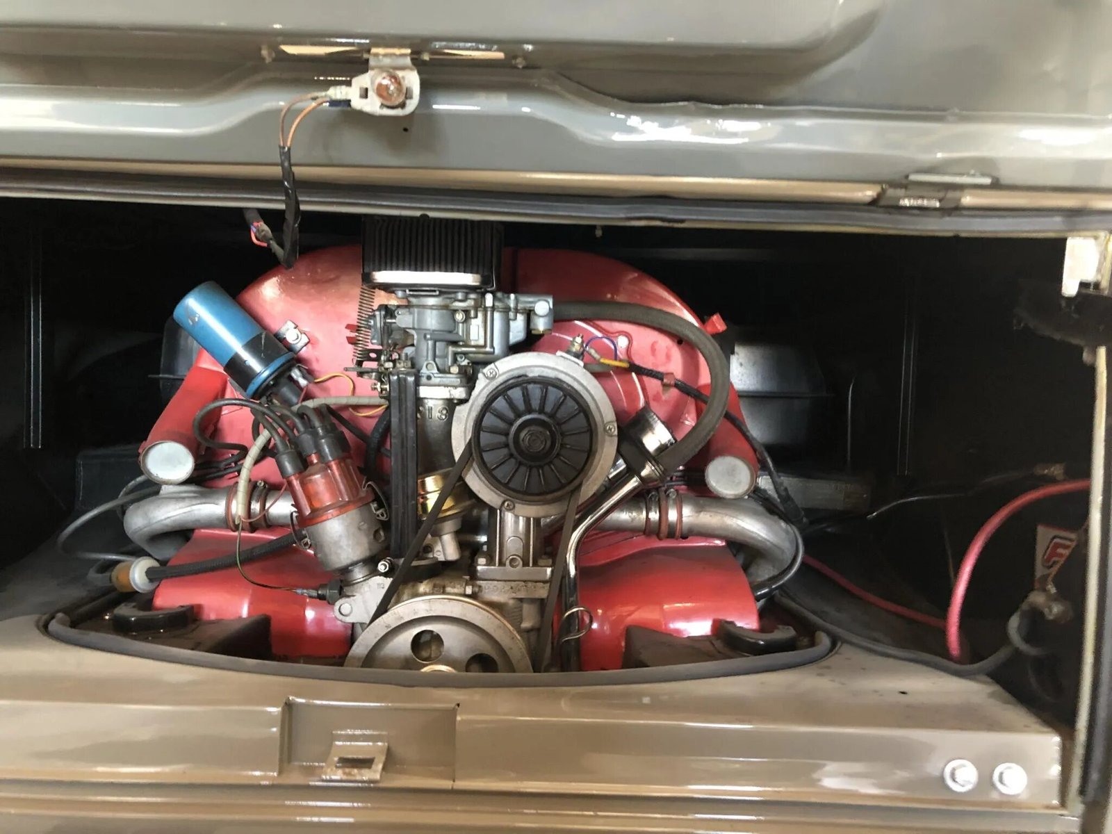 The replacement dual-port 1.6L flat-four was installed and drives the rear wheels through a four-speed manual transaxle. The engine is equipped with a single carburetor and red-painted tins. An aftermarket exhaust system is fitted.