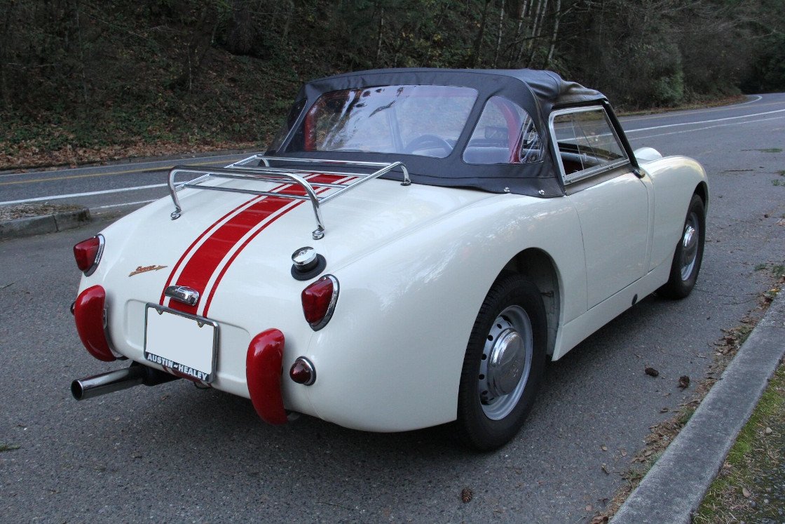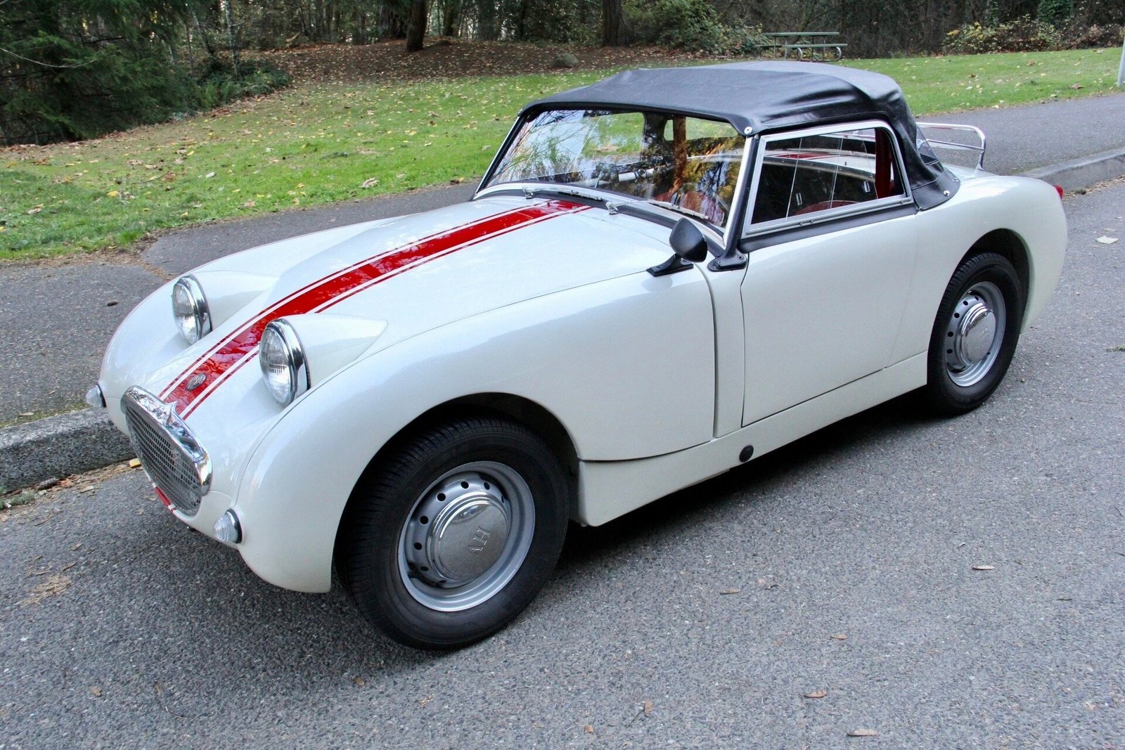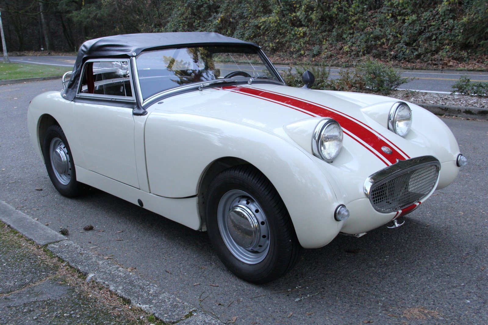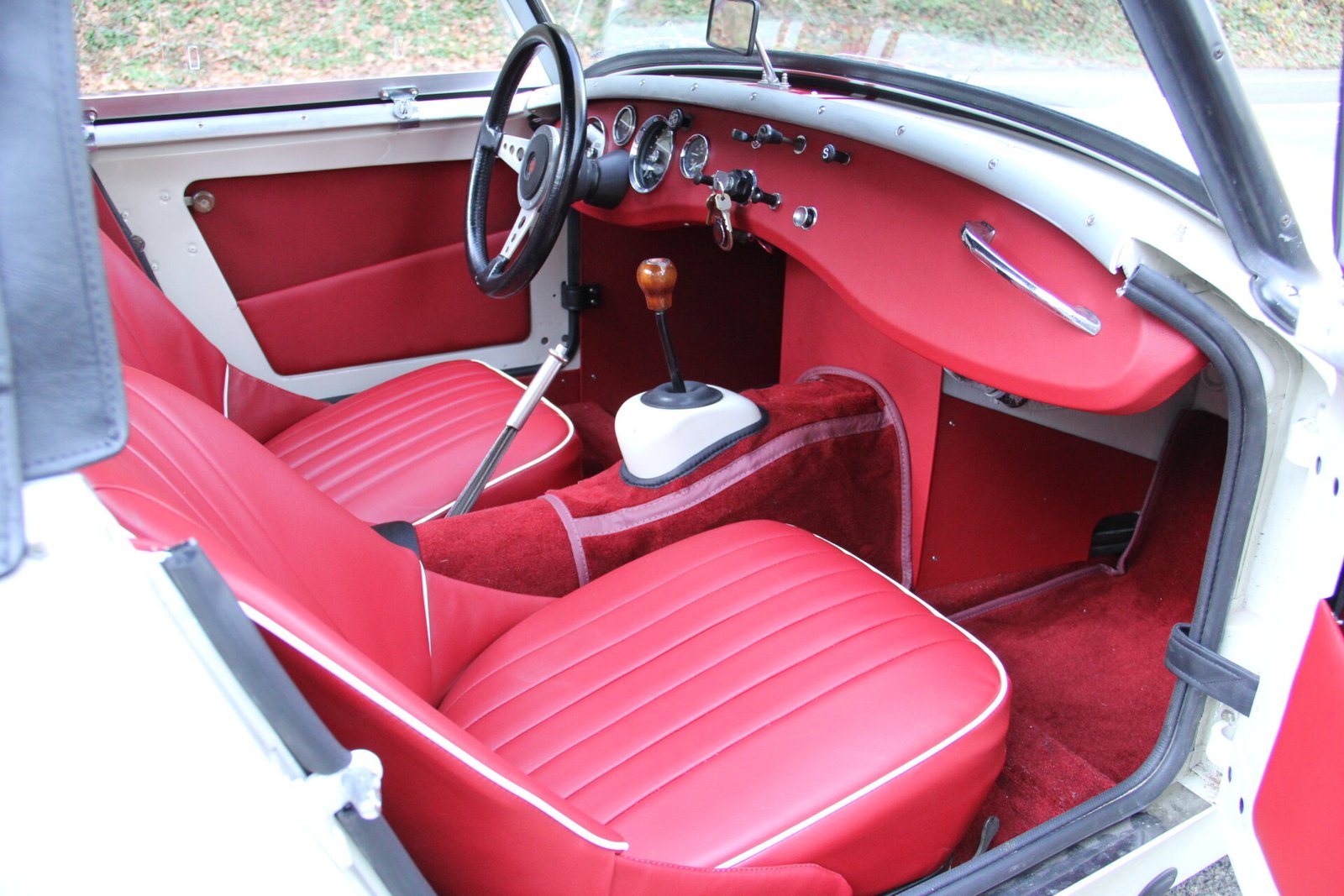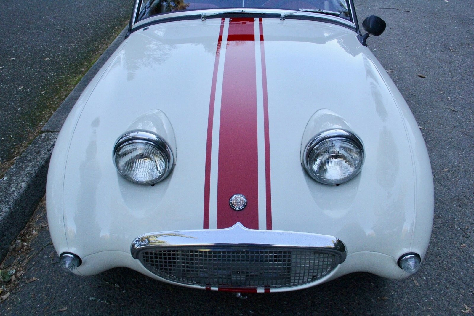 This 1959 Austin-Healey Sprite is finished in white over a reupholstered red interior.