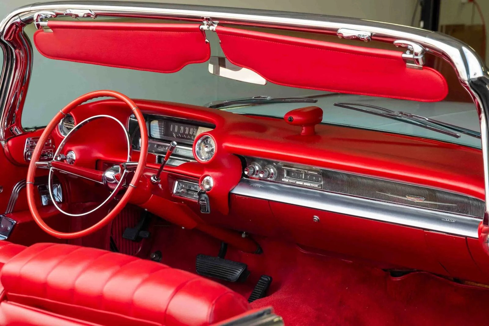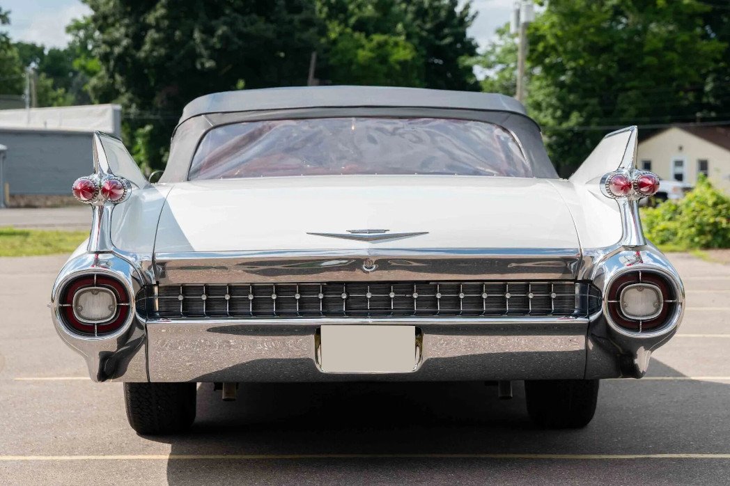 Cadillac offered four models for 1959, all measuring 225″ in overall length and featuring updated front and rear grilles, dual-bullet taillights, and upright fins. A total of 11,130 Series 62 convertibles were produced for the model year, and this example left the factory finished in Dover White. The car was repainted, while the chrome was replated in 2022. Features include a power-operated black soft top, a driver-side mirror, quad headlamps, and fender skirts.