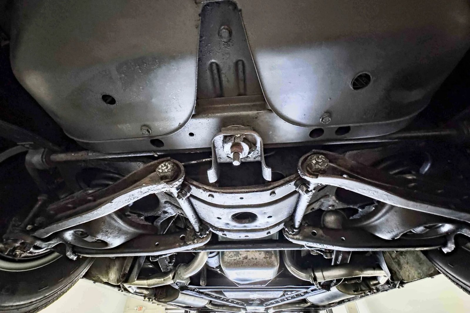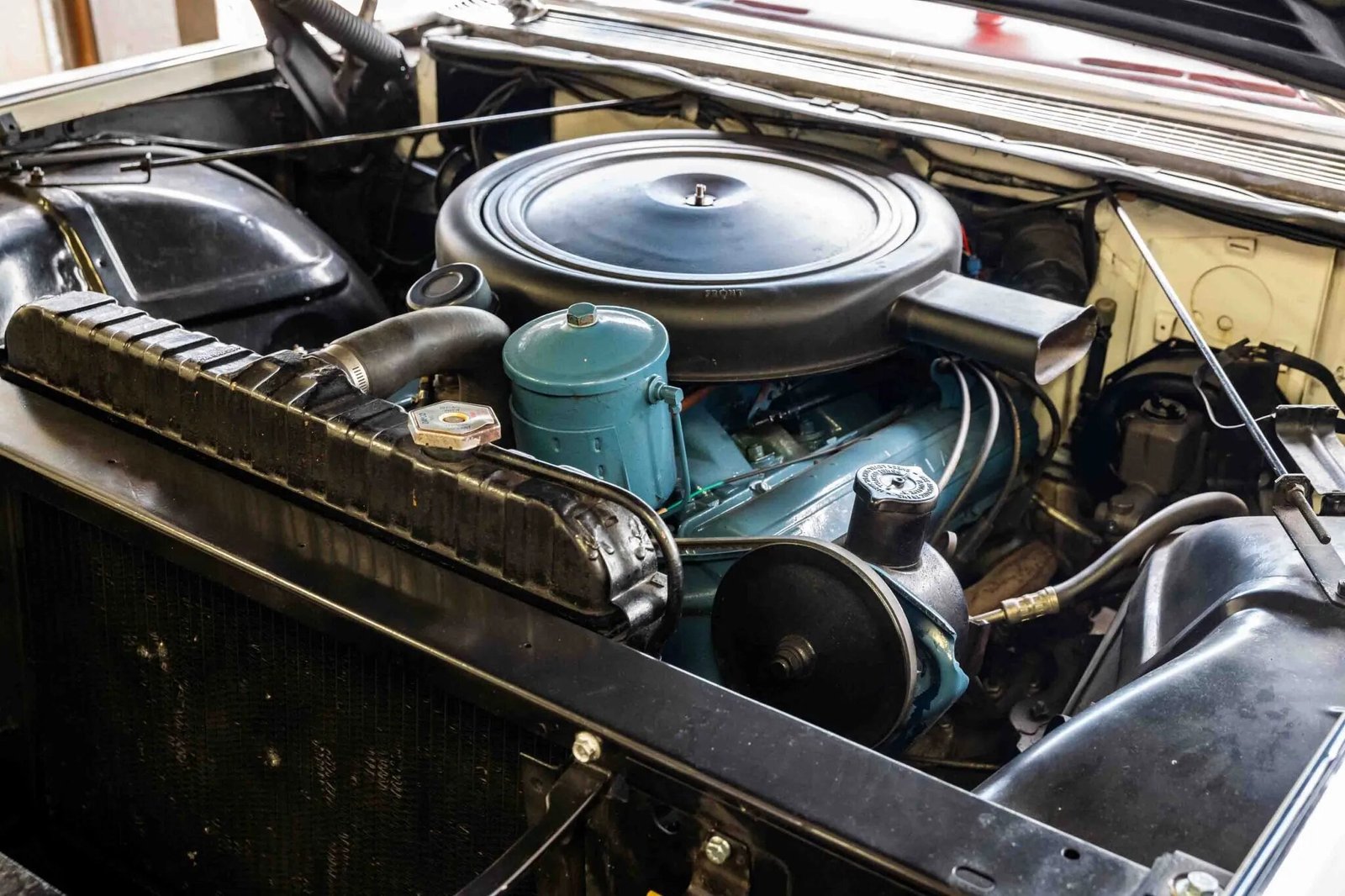 Steel wheels wear chrome covers and are mounted with Goodyear whitewall tires, and a full-size spare is stowed in the carpeted trunk. The car is equipped with power steering, and braking is handled by power-assisted drums at all four corners. The brake booster and master cylinder were replaced, and new front brake linings were installed in anticipation of the sale.