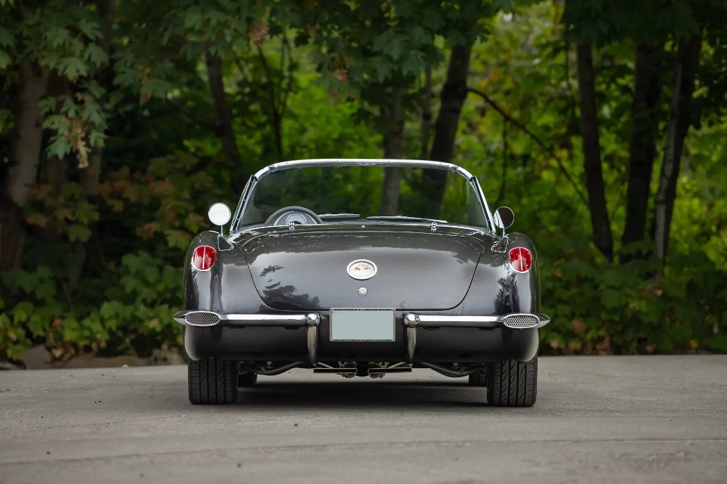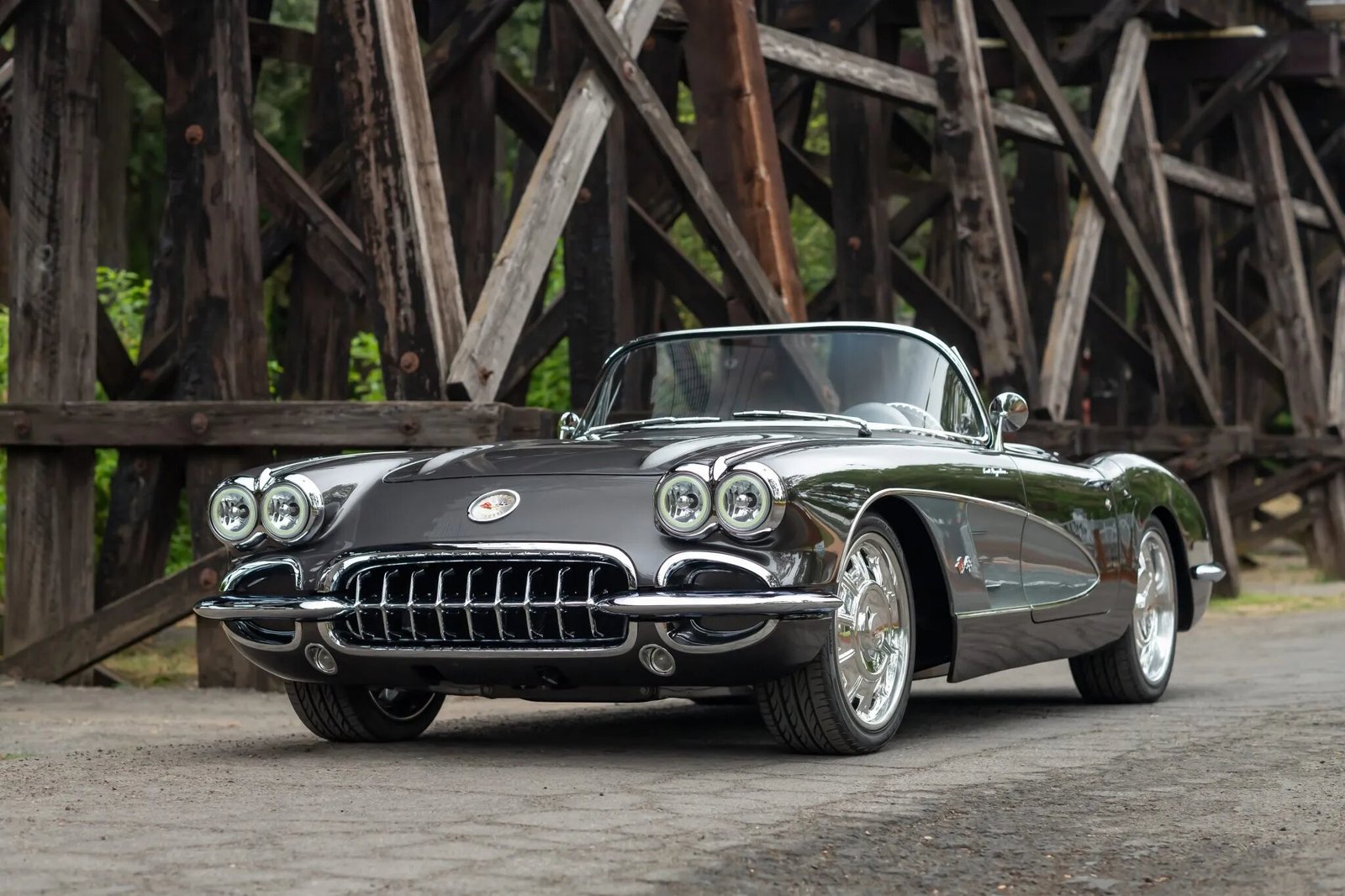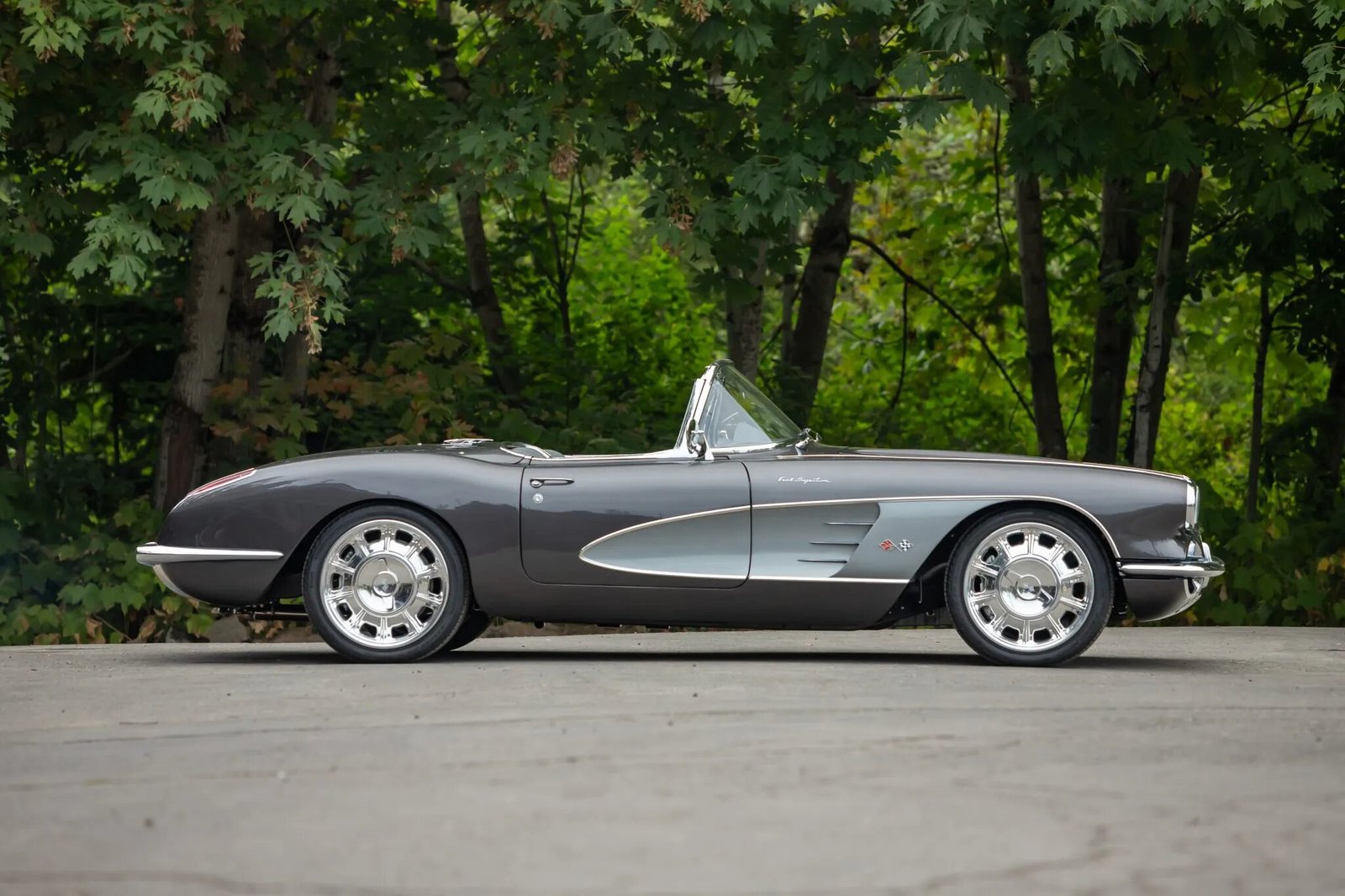This 1959 Chevrolet Corvette was modified and refurbished, and it is powered by a 6.2-liter Gen V LT1 V8 paired with a 4L60 four-speed automatic transmission. The car wears a metallic gray finish with silver coves and a black soft top, and it rides on an Art Morrison chassis with an independent front suspension, a multi-link rear setup, and Hyperco coilovers along with 19″ Curtis Speed wheels mounted over four-wheel disc brakes. The cabin is outfitted with gray leather upholstery, a Vintage Air climate control system, an Alpine stereo head unit, and Dakota Digital instrumentation. The valve seals were replaced and an oil change was performed in preparation for sale.
