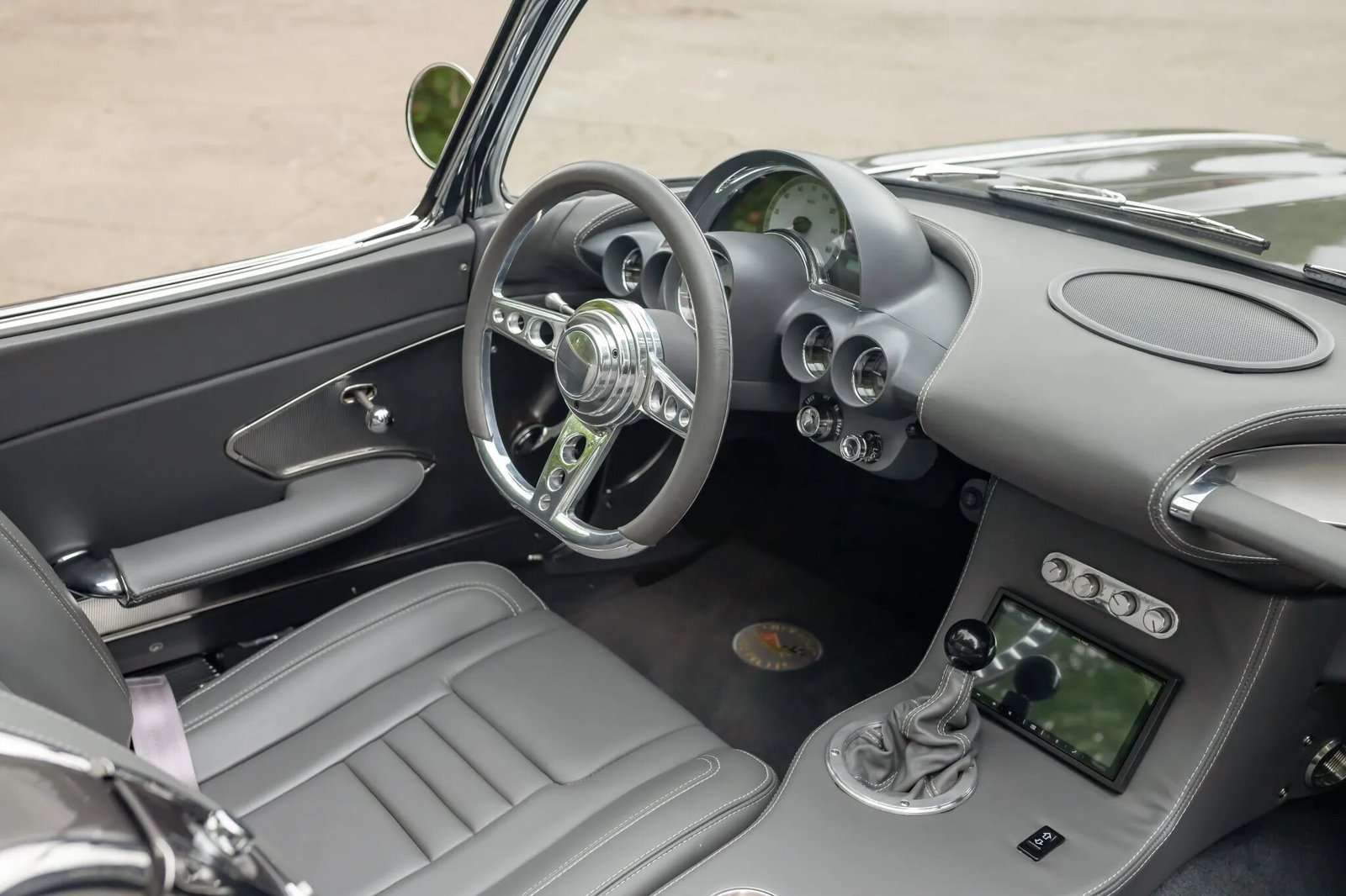 The bucket seats, dashboard, and center console are upholstered in gray leather with white stitching, and metal trim accents the doors. Ceramic sound and heat insulation was reportedly applied to the floors during the build, and the firewall was moved forward by approximately four inches. Equipment includes a Vintage Air climate control system, a touch-screen Alpine head unit, and lap belts.