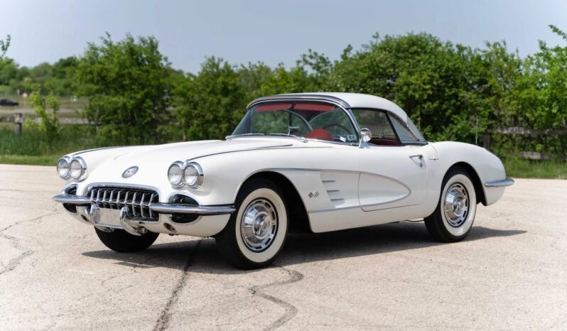 This 1959 Chevrolet Corvette is powered by a 283ci V8 paired with a four-speed manual transmission and is finished in white over red vinyl. Equipment includes a white soft top, a removable body-color hardtop, 15″ steel wheels, an AM/FM cassette stereo, and a dash-mounted rearview mirror.