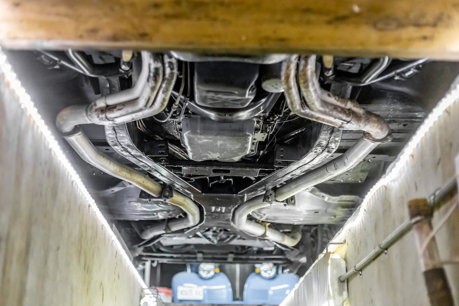 The car rides on air suspension with dual compressors mounted beneath the bed.