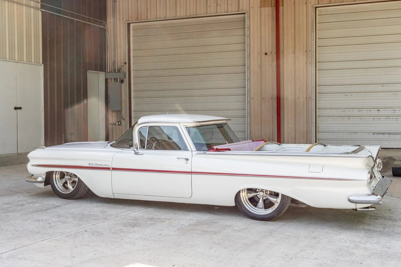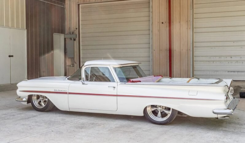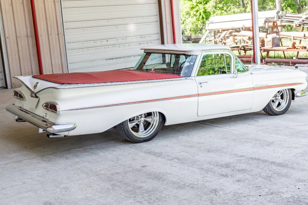 This 1959 Chevrolet El Camino is finished in white over red leather and powered by a replacement 350ci V8 paired with a 2004R four-speed automatic transmission.