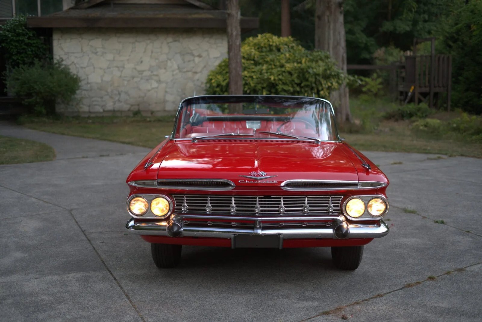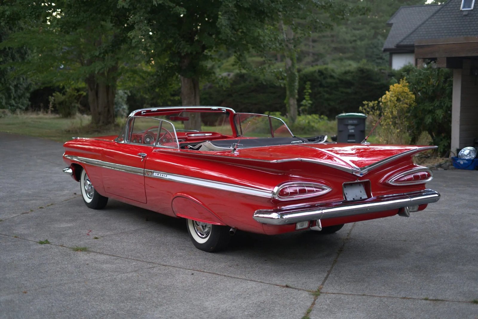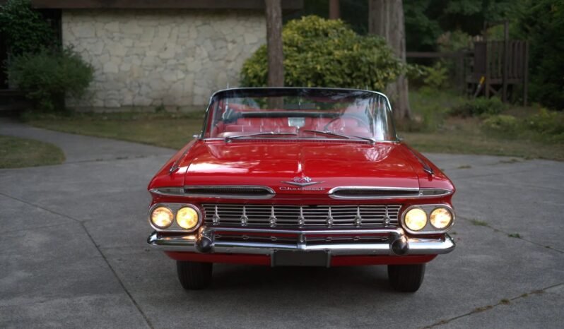 This 1959 Chevrolet Impala convertible is powered by a 348ci V8 with three two-barrel carburetors. Work under previous ownership consisted of removing the body from the frame, repairing rust, and repainting the car in red along with refurbishing the tri-tone interior and overhauling the chassis. A TH350 three-speed automatic transmission is fitted along with a power-operated white soft top, rear fender skirts, dual rear antennas, power steering, power drum brakes, spinner-style wheel covers, power windows, a push-button AM radio, and a dual exhaust system.
