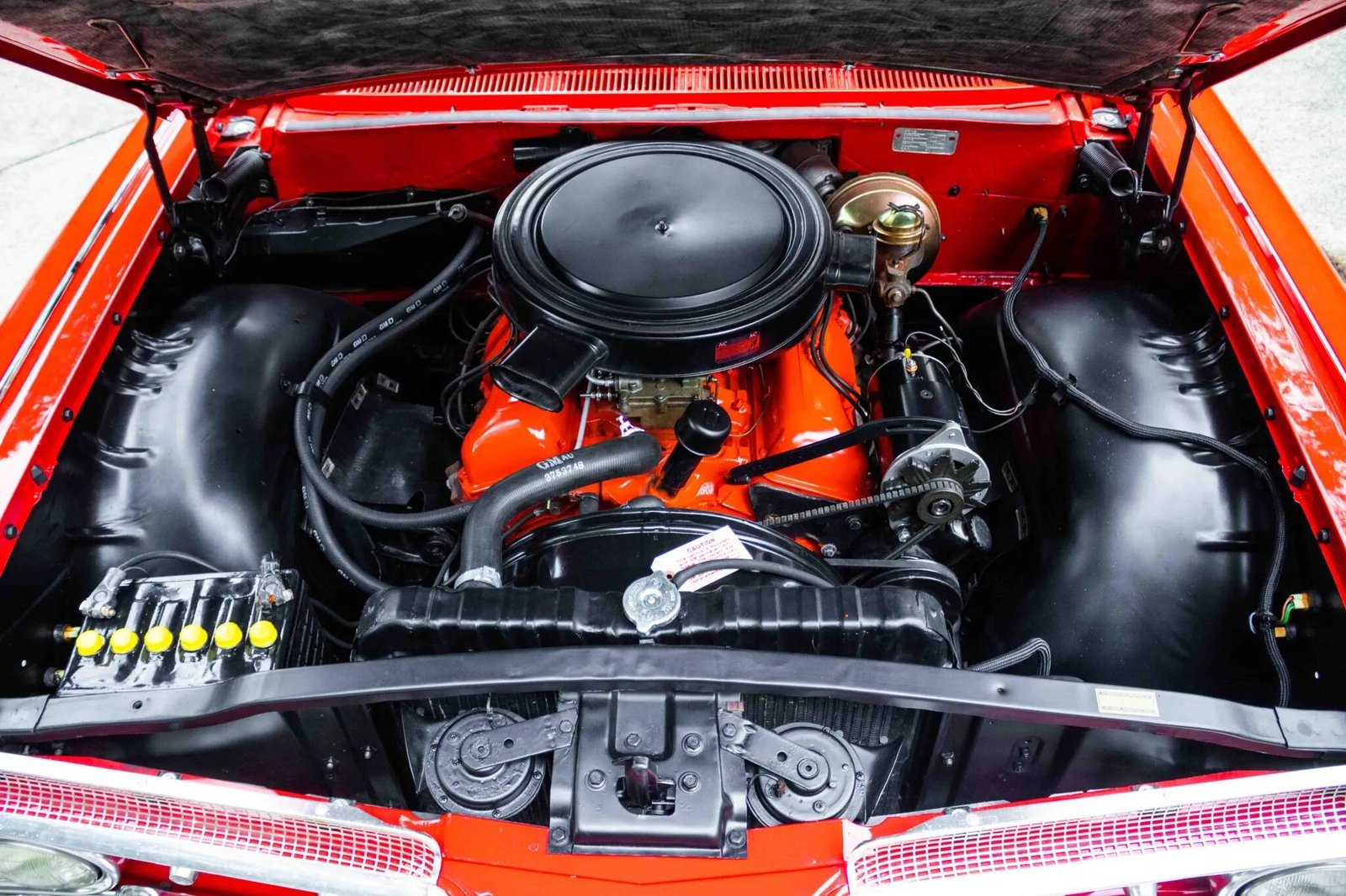 The 348ci V8 is topped with triple two-barrel carburetors and features a dual-snorkel air intake assembly and an orange engine block, intake manifold, and valve covers. The oil was changed and the battery was replaced in preparation for sale. Power is sent to the rear wheels via a TH350 three-speed automatic transmission. A replacement dual exhaust system has been installed.