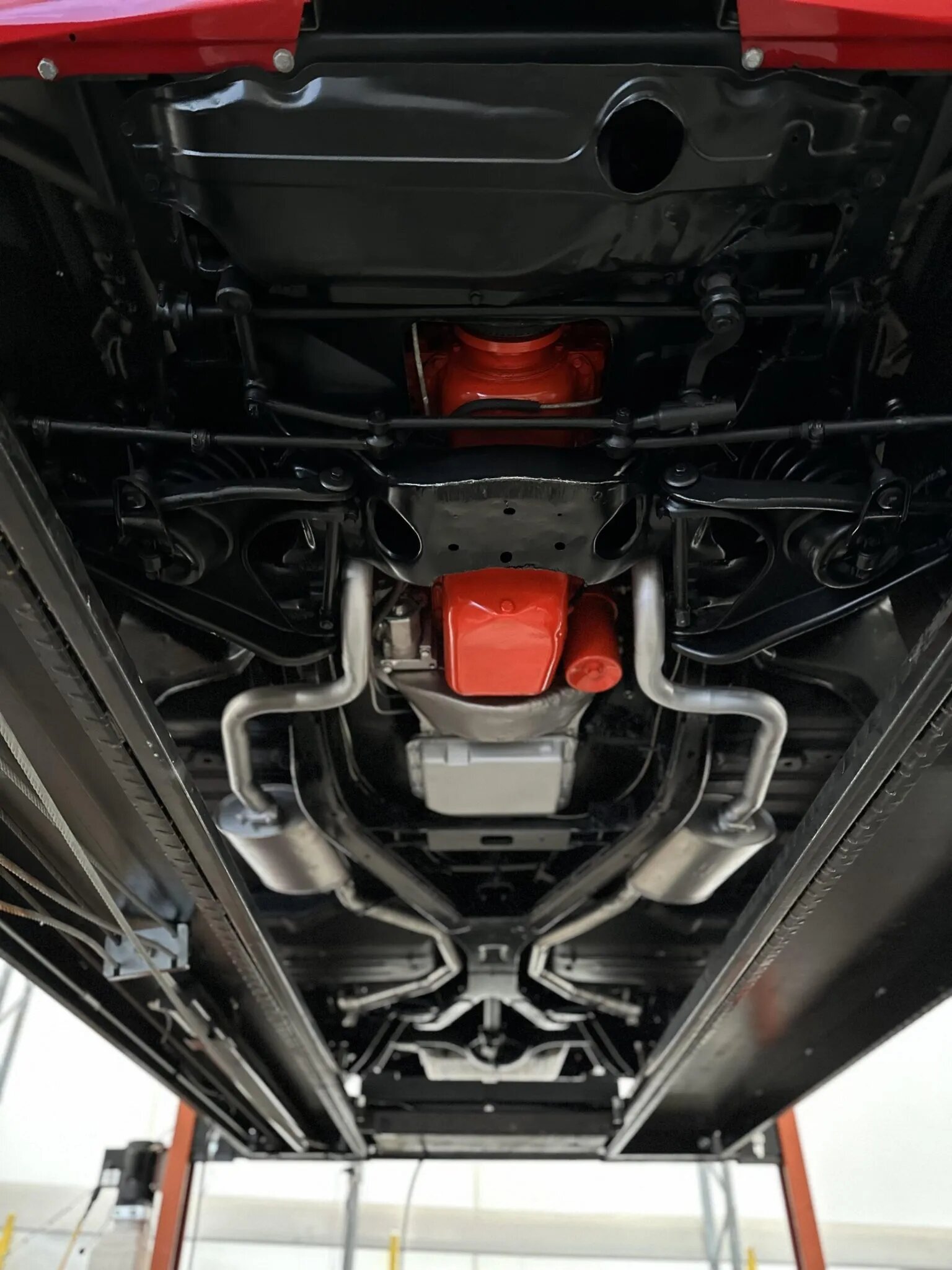 Black 14″ steel wheels wear spinner-style covers and are mounted with Coker Classic whitewall tires. A full-size spare is located in the trunk. The car is equipped with power steering, and braking is handled by power-assisted drums at each corner.