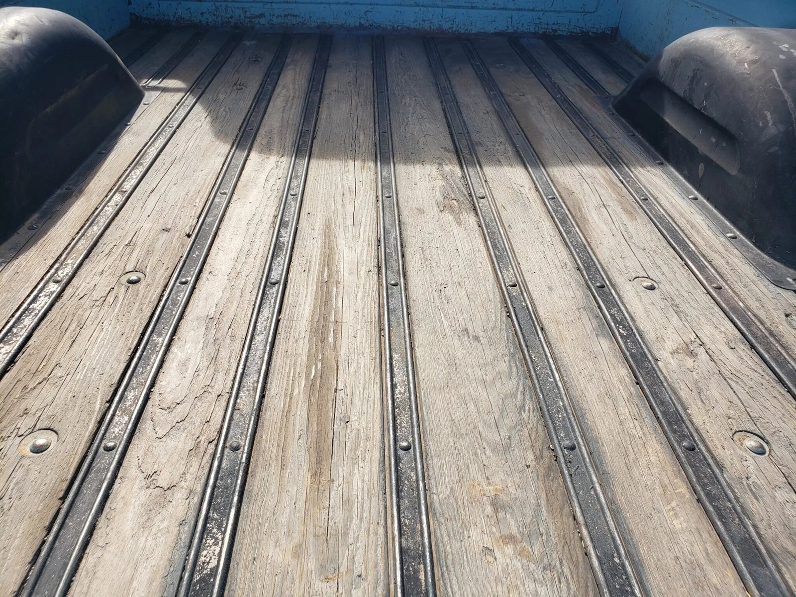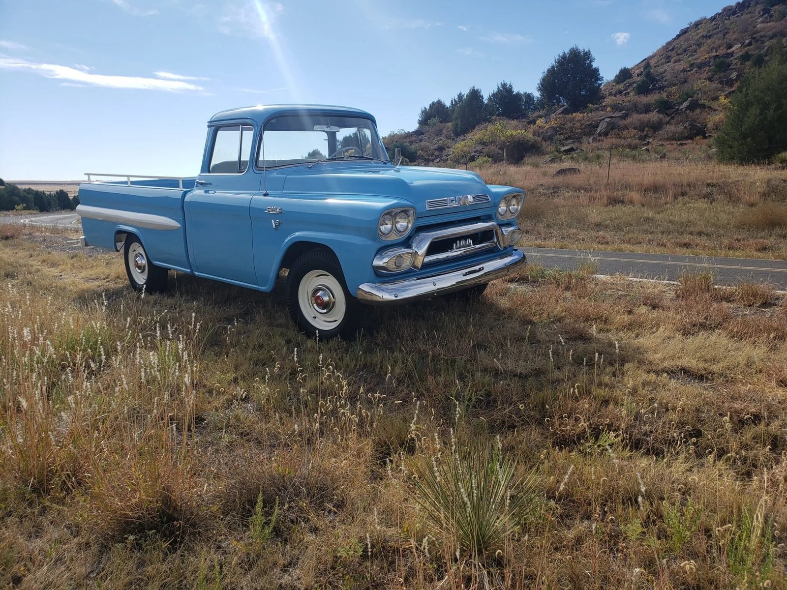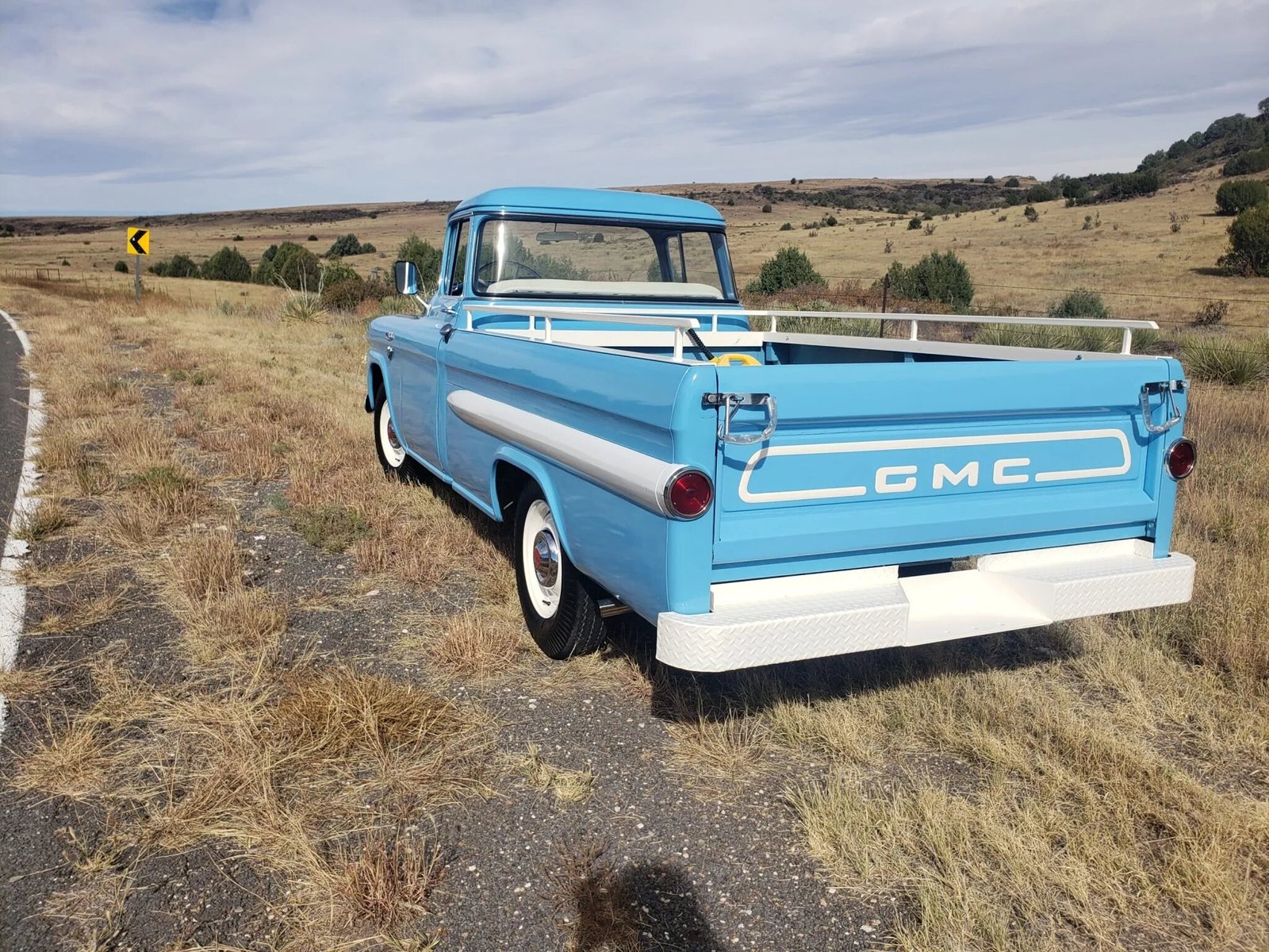 The truck is finished in blue over a blue and white interior, and power is provided by a Pontiac 336ci V8 paired with a floor-shifted four-speed manual transmission. Recommissioning since 2015 following approximately three decades of storage have included a tune-up, servicing the brakes, and replacement of the carpets, carburetor, exhaust, coolant hoses, fuel pump, shocks, throwout bearing, and third gear synchro.