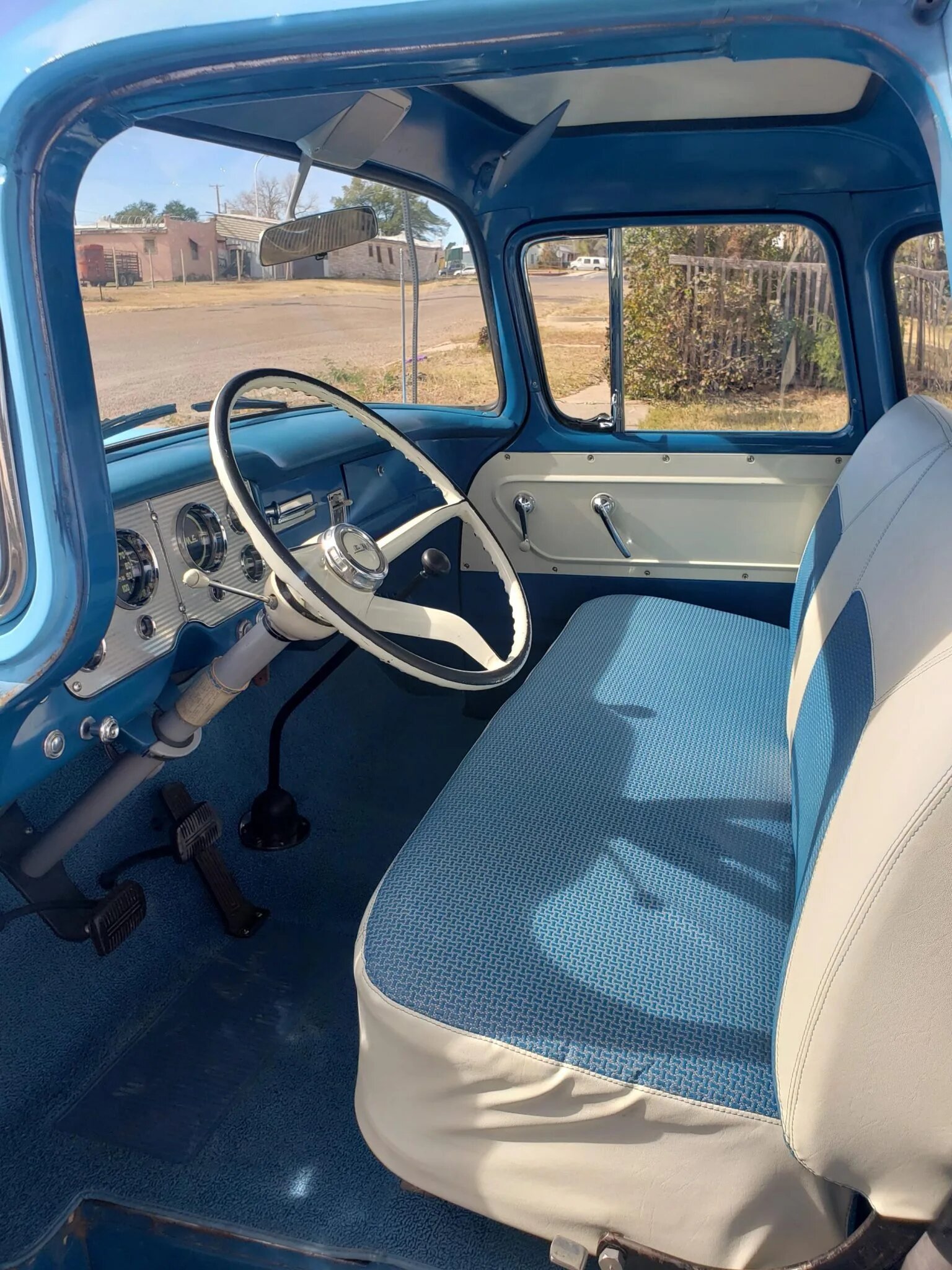 The cabin features a blue and white bench seat upholstered in cloth and vinyl along with replacement carpets.