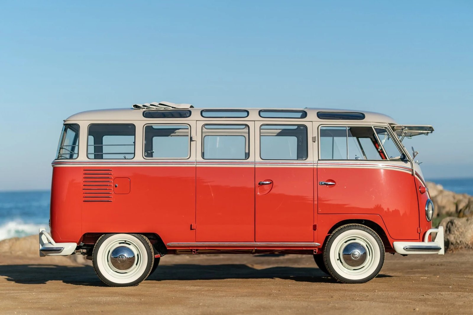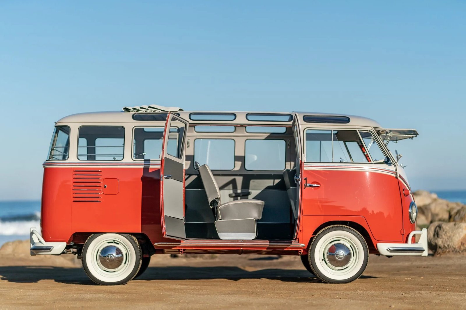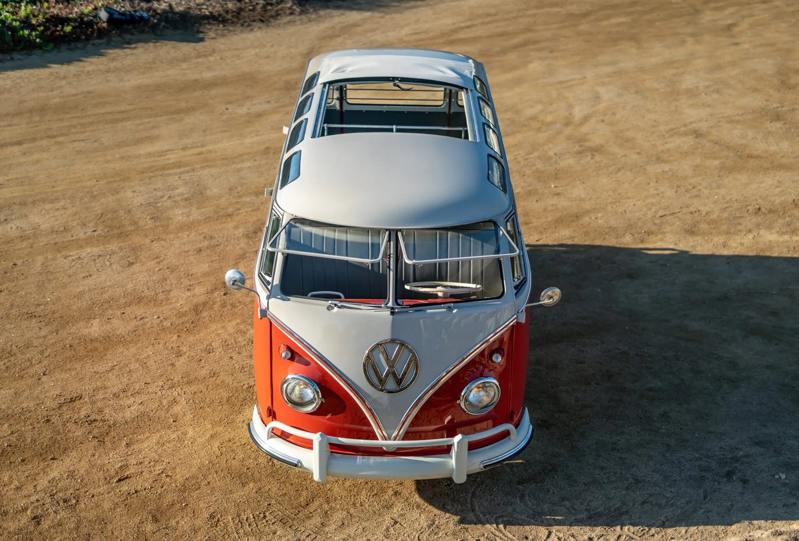 The bus received bodywork and a repaint in factory Beige Grey over Sealing Wax Red during the 2017 refurbishment and features a replacement white sliding canvas roof insert.