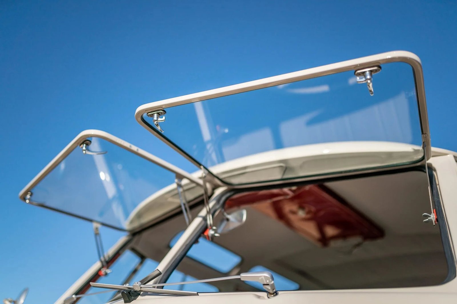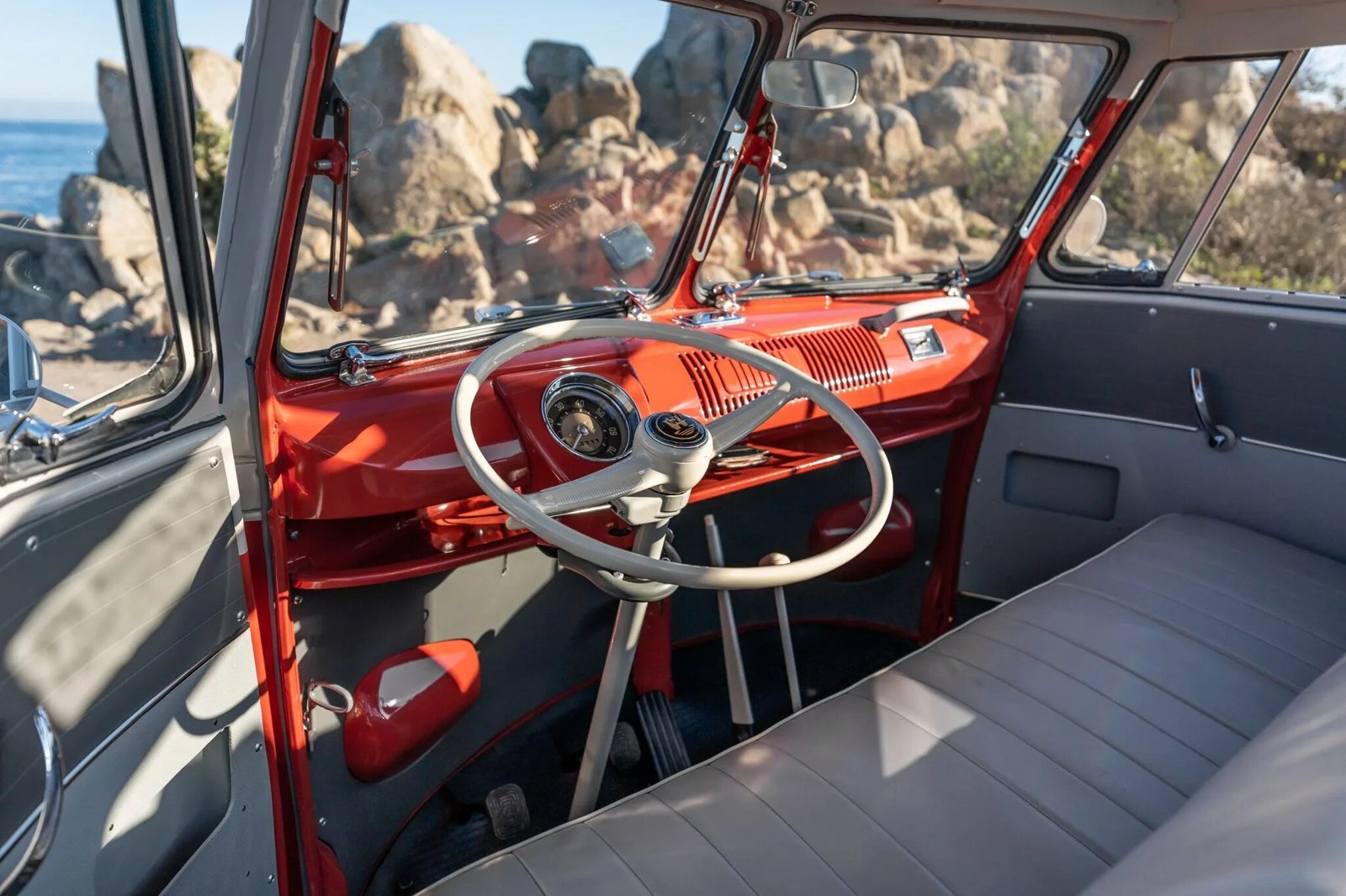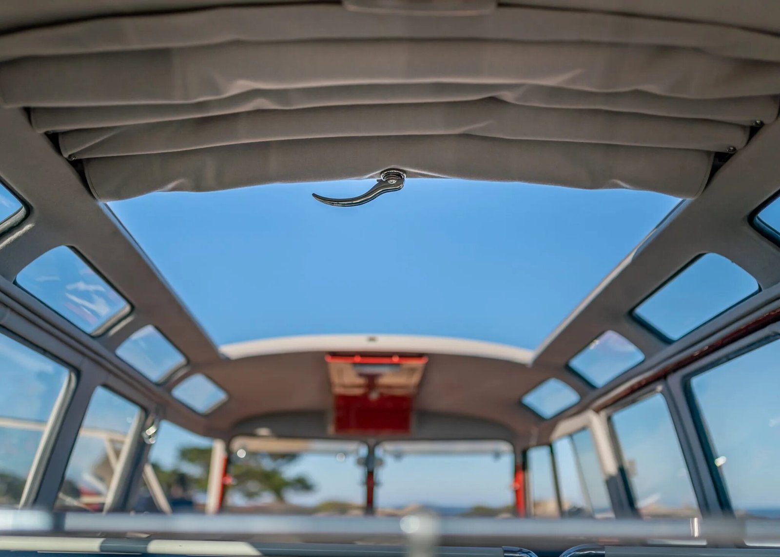 The cabin was reupholstered in factory-style two-tone gray vinyl on the seats, doors, and interior panels during the refurbishment, and a white German mohair headliner was also installed.