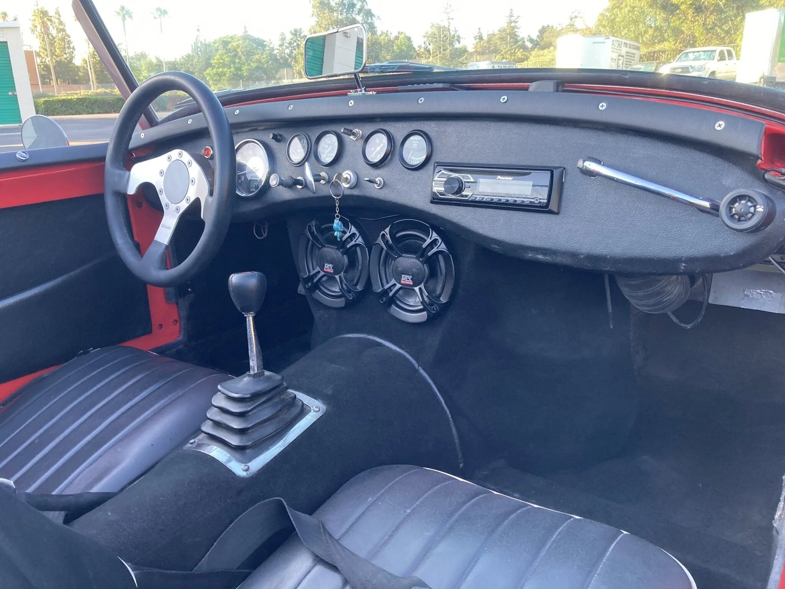 Equipment includes a roll bar, lap belts, a dash-mounted rear-view mirror, and a Pioneer stereo with an auxiliary input and four speakers.