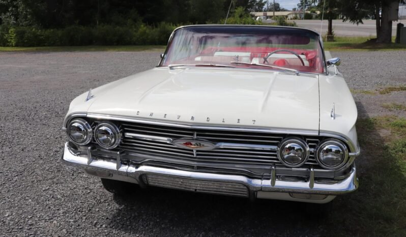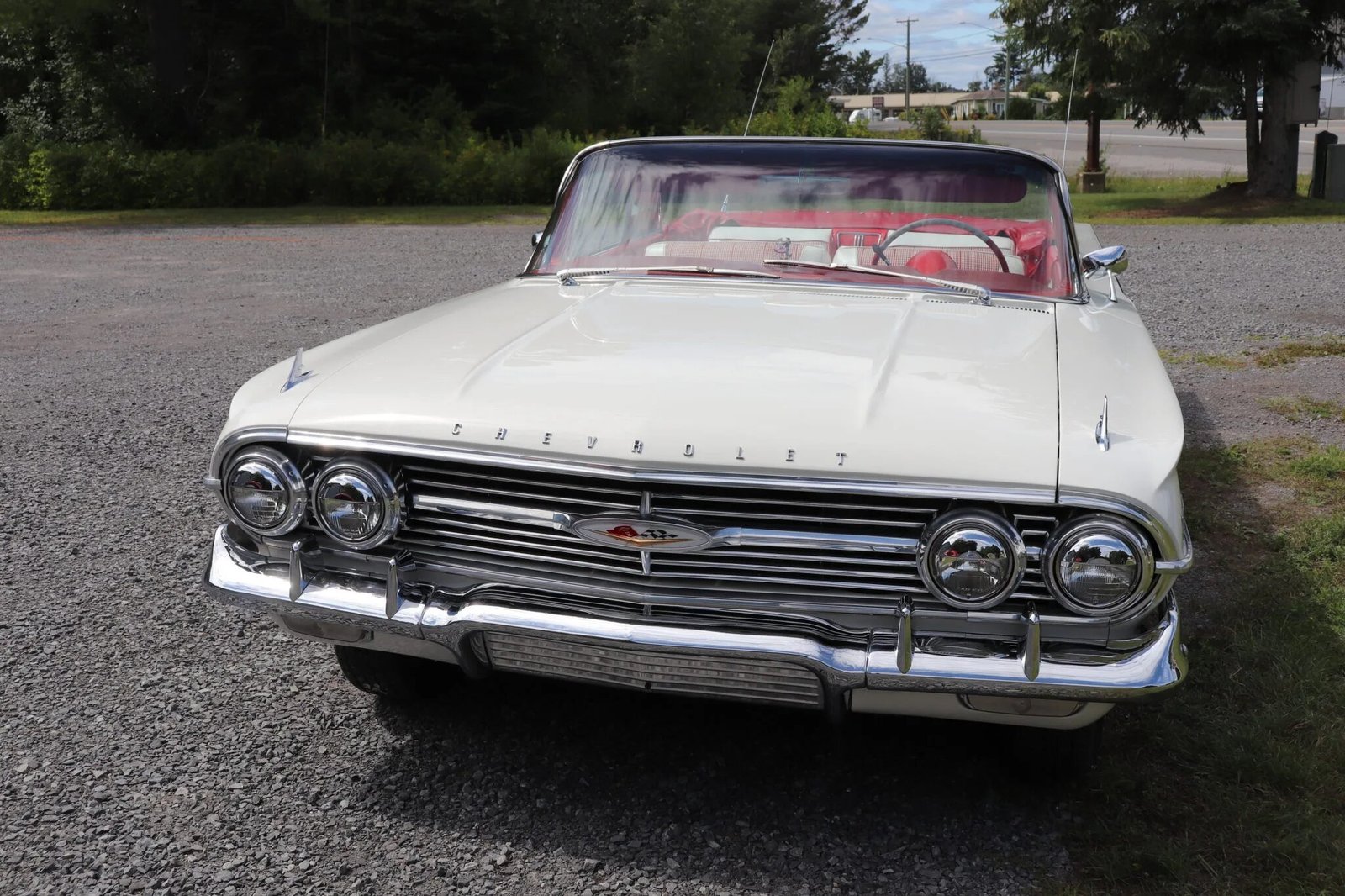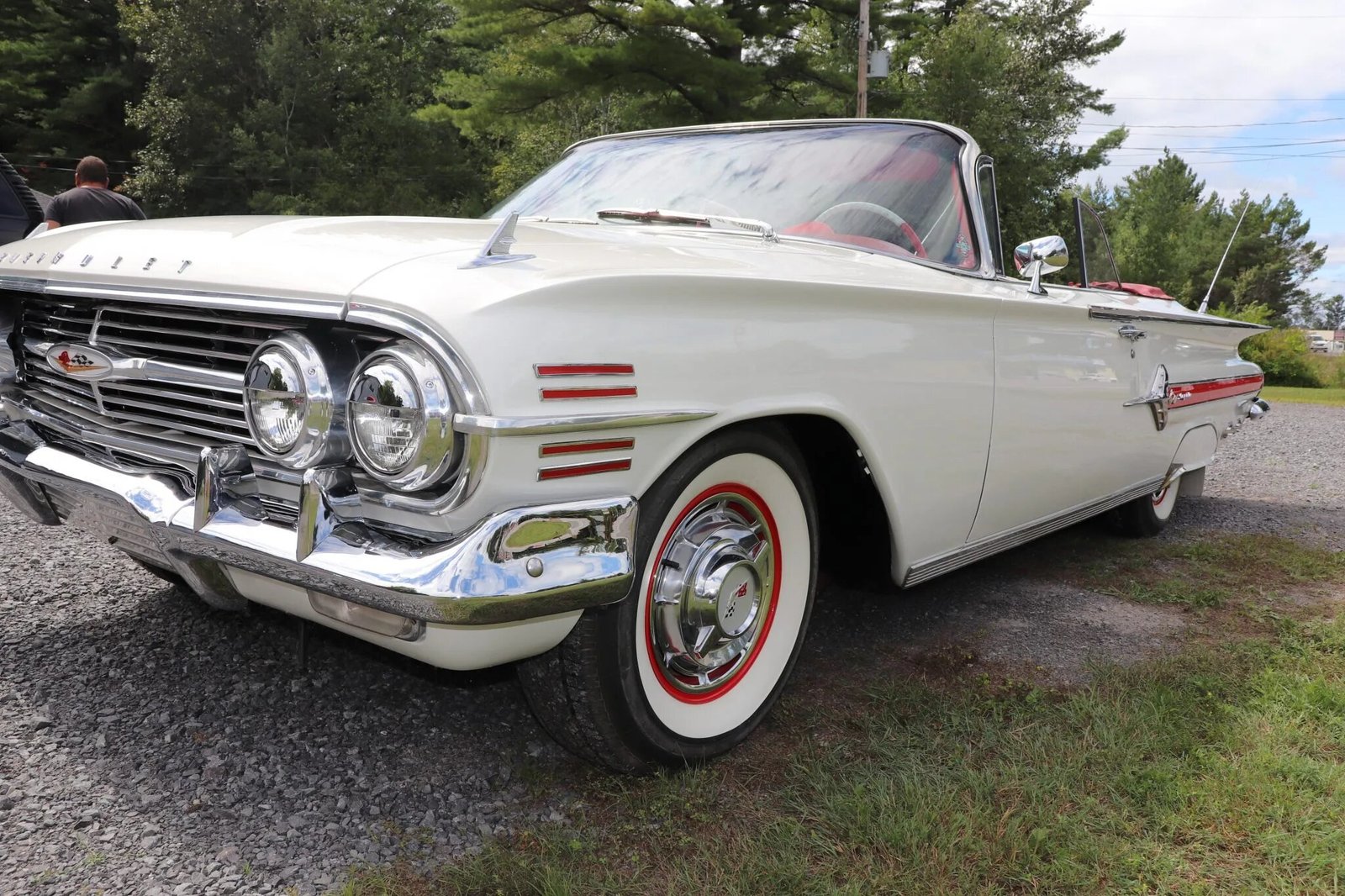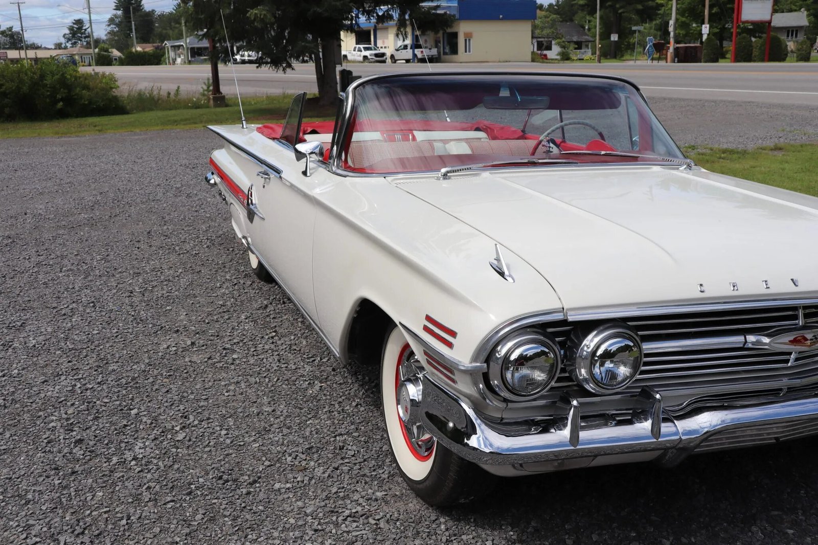 This 1960 Chevrolet Impala convertible is finished in Ermine White with red and white vinyl upholstery and powered by a 348ci V8 paired with a two-speed automatic transmission. Equipment includes a black soft top, a red boot cover, 14″ steel wheels, whitewall tires, chrome bumpers and trim, dual antennas, and a push-button AM radio.