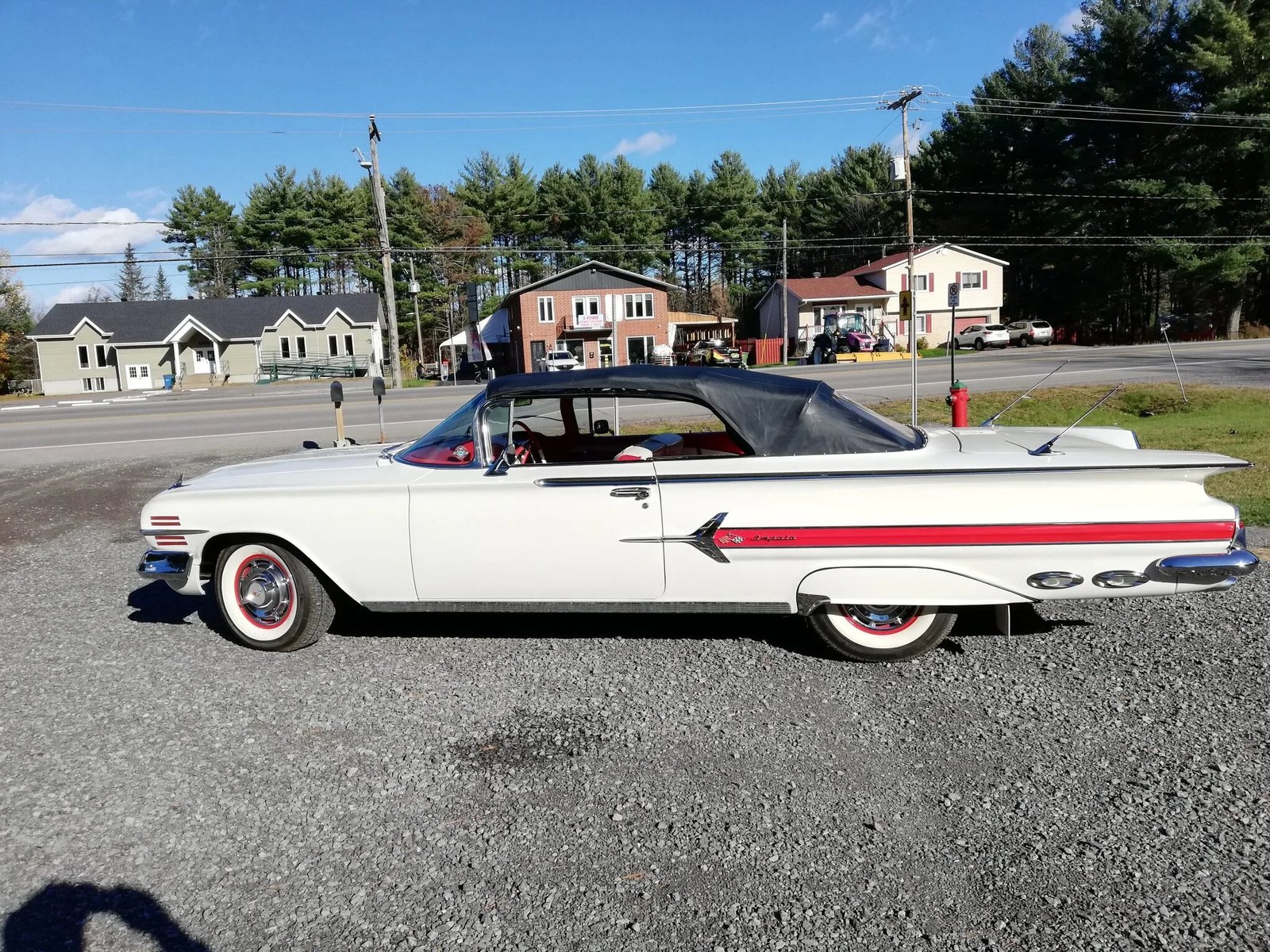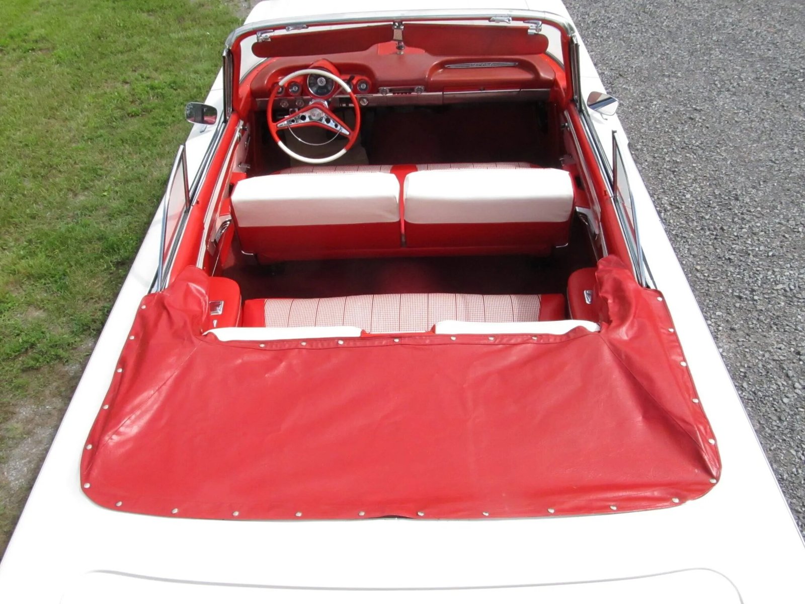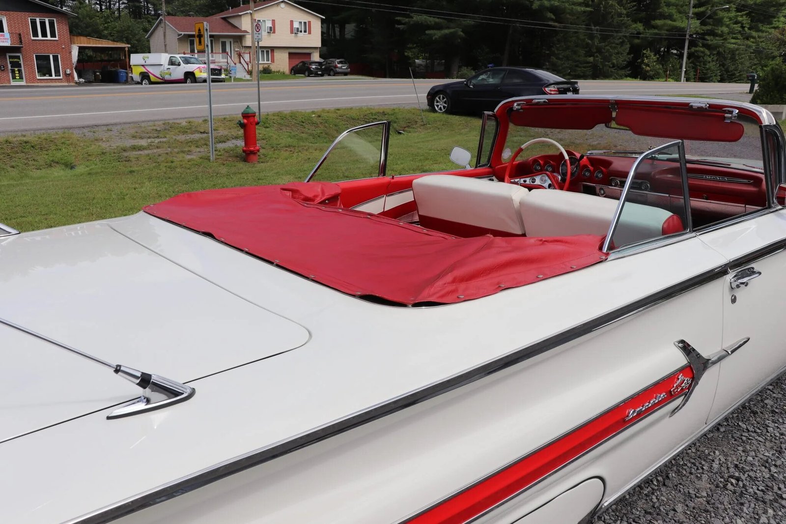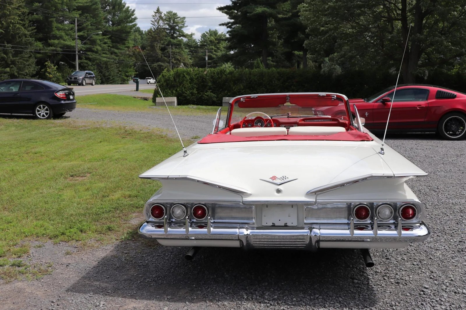 This 1960 Chevrolet Impala convertible is finished in Ermine White with red and white vinyl upholstery and powered by a 348ci V8 paired with a two-speed automatic transmission. Equipment includes a black soft top, a red boot cover, 14″ steel wheels, whitewall tires, chrome bumpers and trim, dual antennas, and a push-button AM radio.