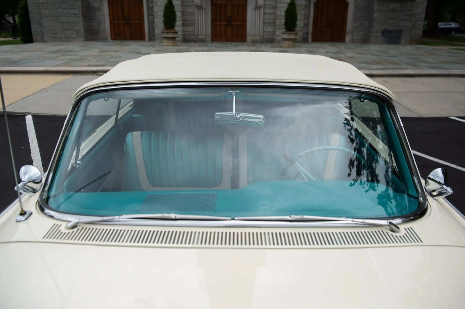 The front and rear benches are upholstered in Turquoise vinyl with white accents. Appointments include a locking glovebox, a heater and defroster, bright door sill plates and trim, and a push-button radio. The carpets have been replaced.