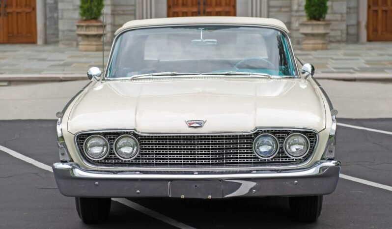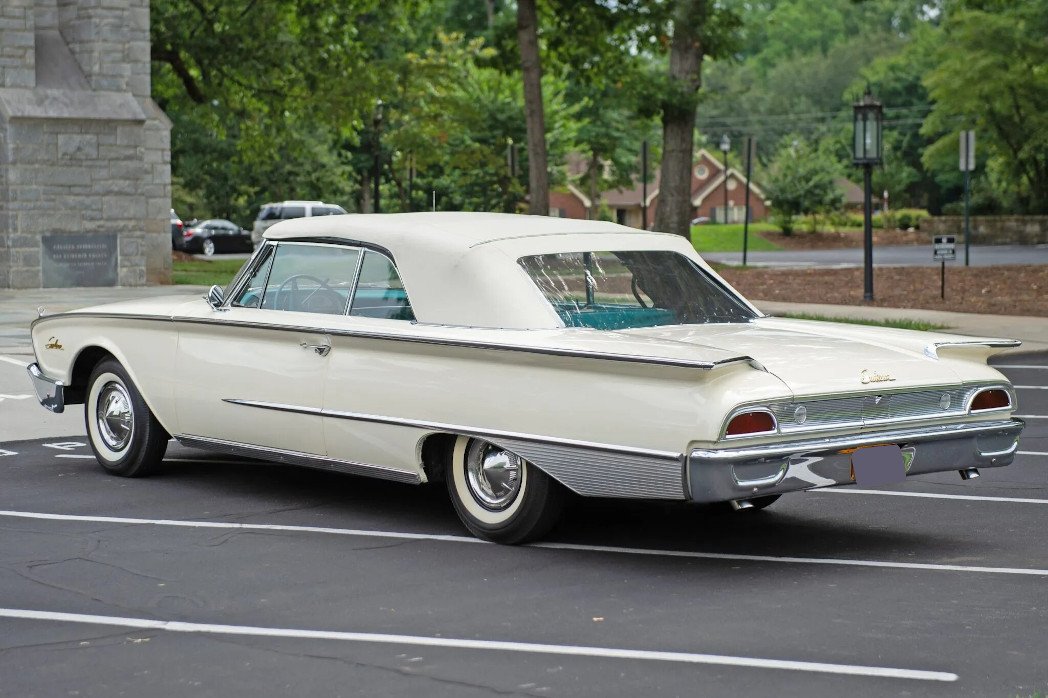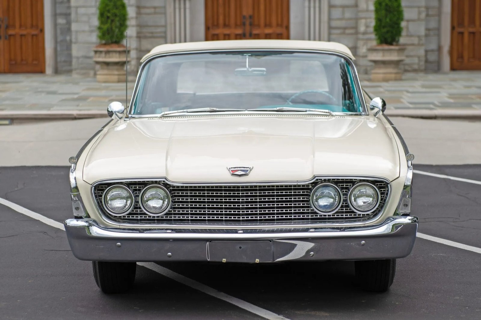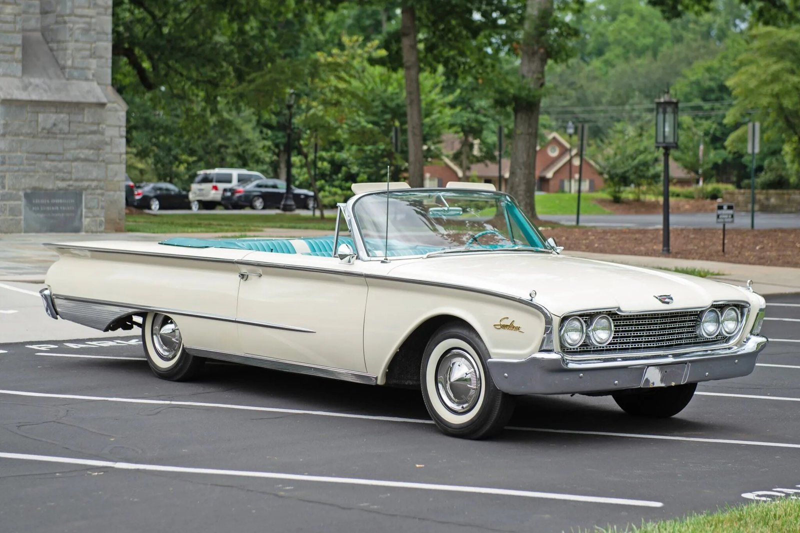 This 1960 Ford Galaxie Sunliner convertible is powered by a 352ci V8 paired with a three-speed Cruise-O-Matic automatic transmission and is finished in white over Turquoise and white vinyl. Work included servicing the brake system, replacing the white soft top, and repainting the exterior. Equipment includes chrome bumpers, dual exhaust outlets, fender ornaments, dual mirrors, a push-button radio, and 14″ wheels with whitewall tires as well as power-assisted steering and brakes.