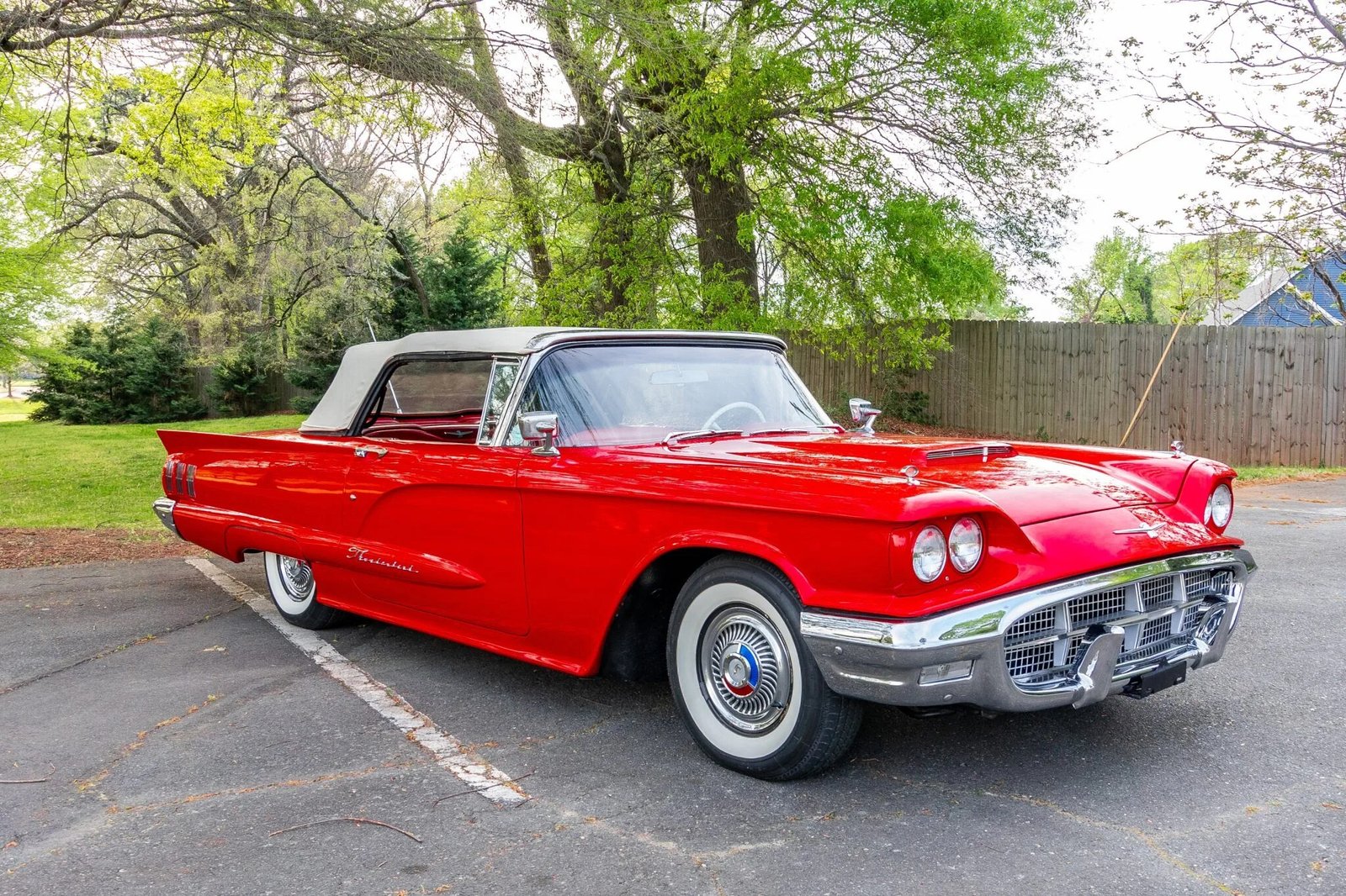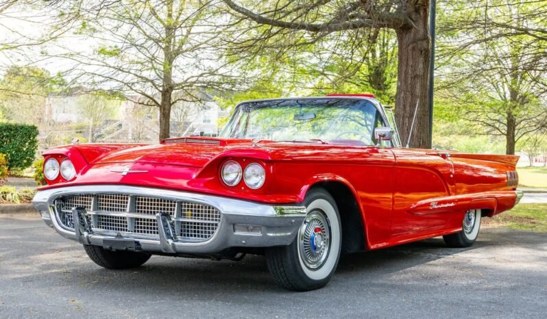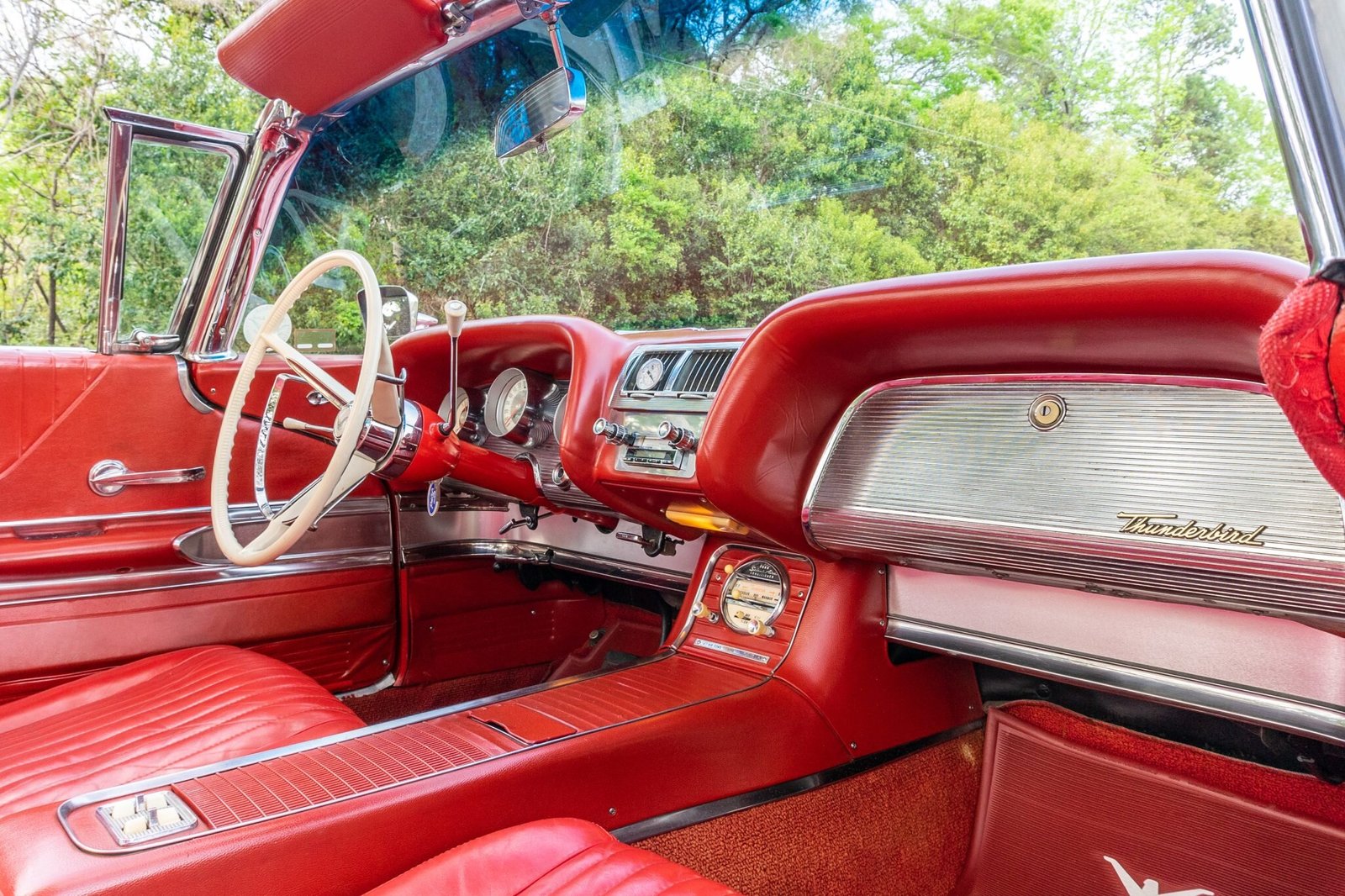 Amenities include electric front seats, floor mats with Thunderbird logos, an aftermarket radio, a locking glove compartment, power windows, and air conditioning, which has been converted to R134a and fitted with a replacement compressor and hoses in preparation for sale.