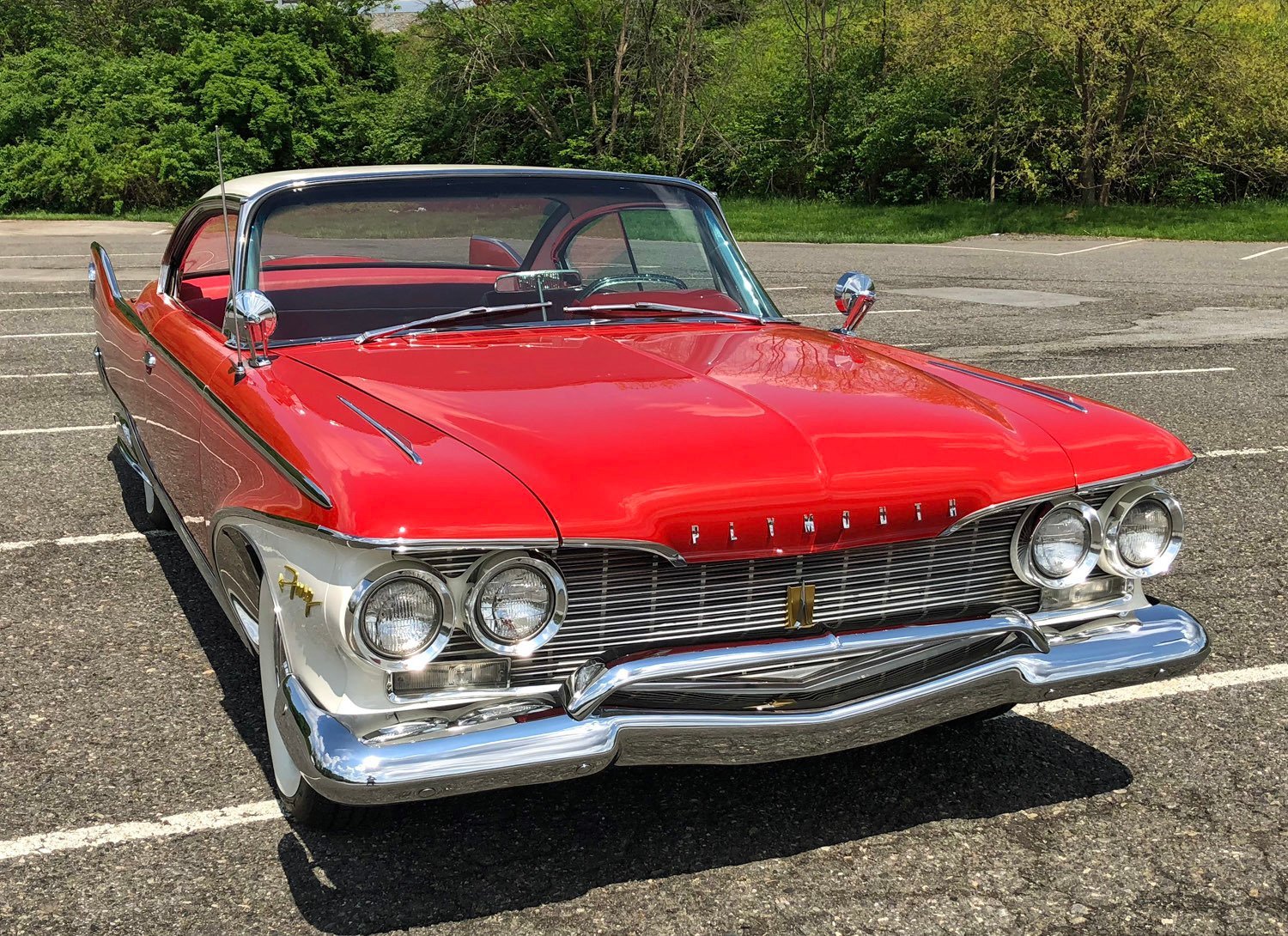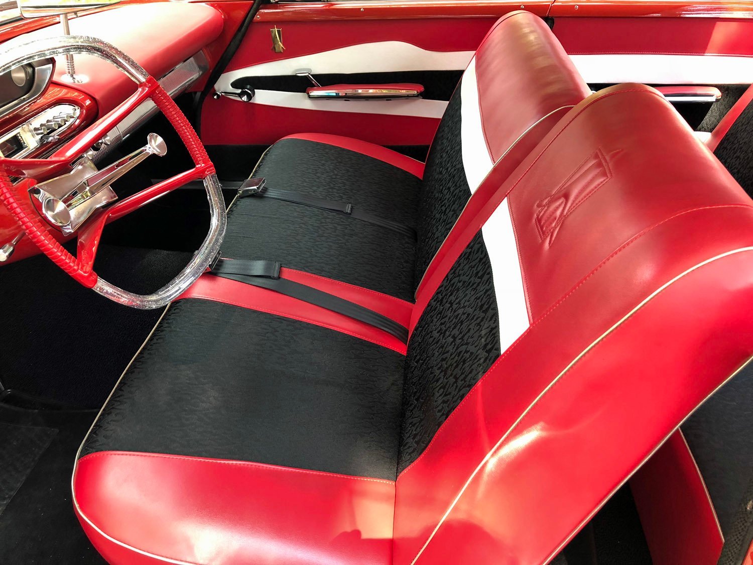 The Red and White paint is in pristine condition and the matching interior was completely restored, including seats, all interior panels, carpet, headliner and dashboard, even a stunning recast of the square “Aero wheel” steering wheel.