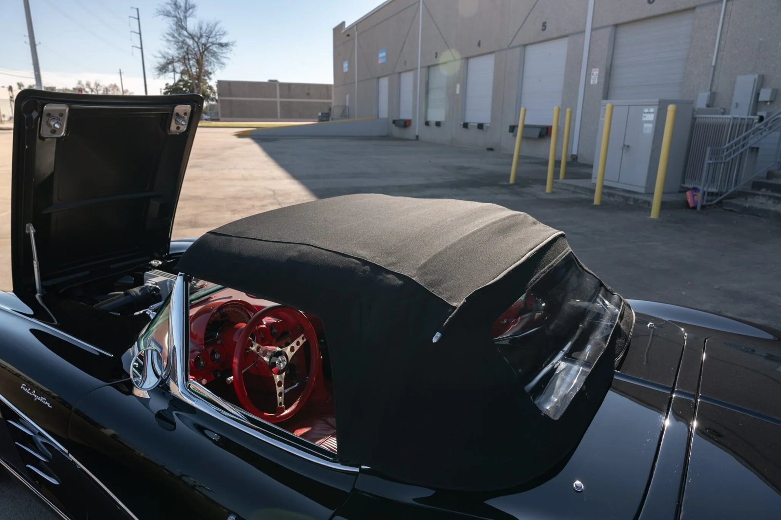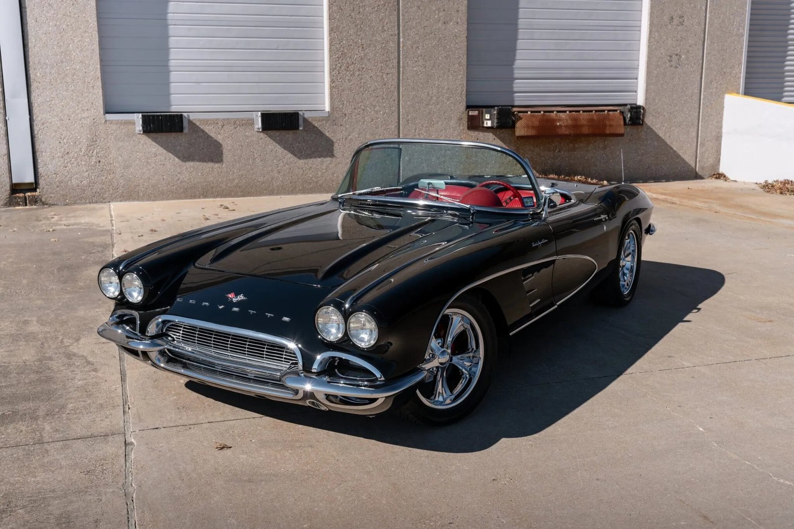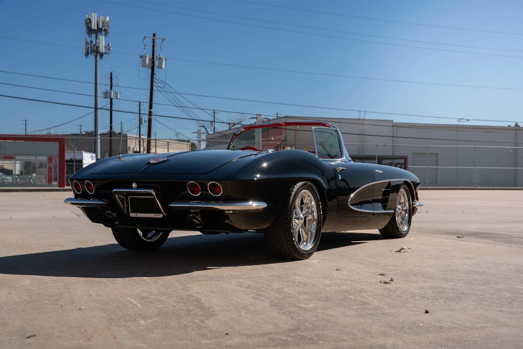 This 1961 Chevrolet Corvette is powered by a 383ci V8 crate engine paired with a five-speed manual transmission and is finished in black over red vinyl. The car underwent a refurbishment in 2019. Equipment includes a black soft top, a Currie 9″ rear end, electronic fuel injection, long-tube headers, a Magnaflow dual exhaust system, 17″ Boyd Coddington wheels, air conditioning, and an aftermarket AM/FM stereo. Work in 2021 included the replacement of the radiator, oil pan, spark plugs, and fuel injectors.