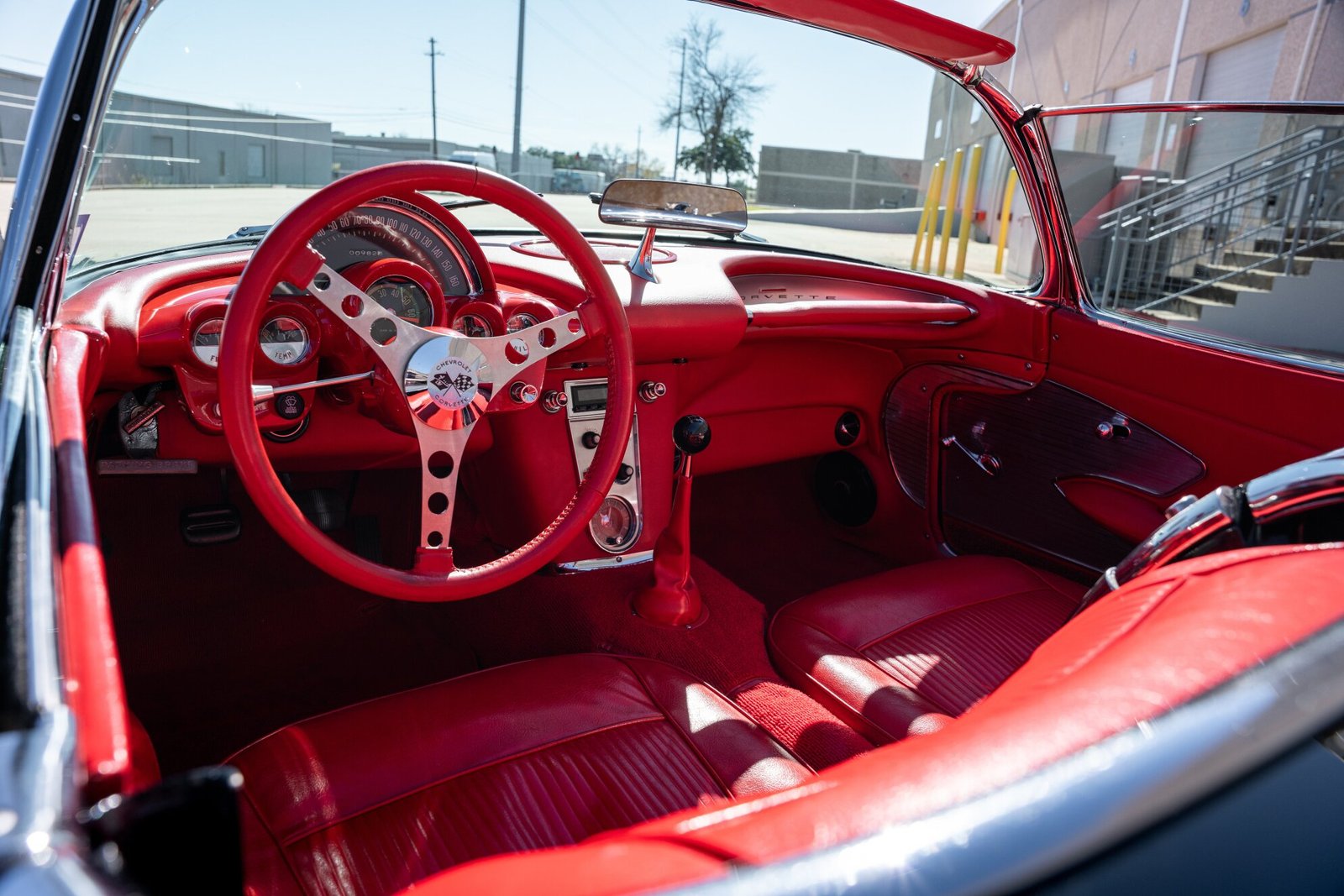 The two bucket seats are upholstered in red vinyl, and interior equipment includes a dash-mounted rearview mirror, air conditioning, an aftermarket AM/FM stereo, and an analog clock.