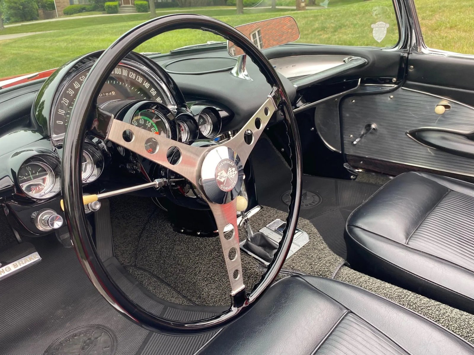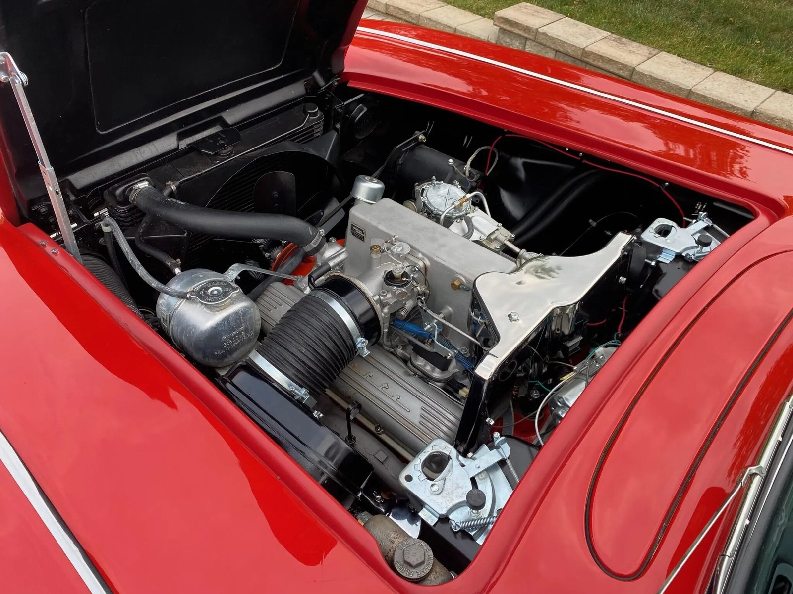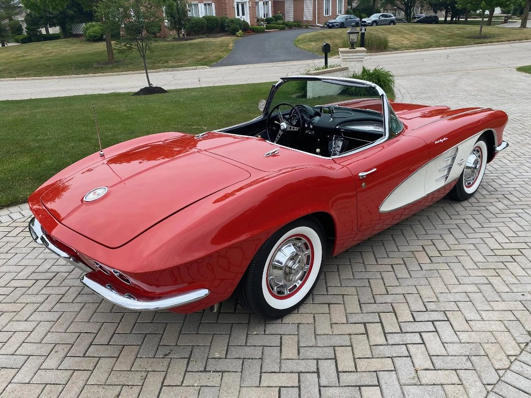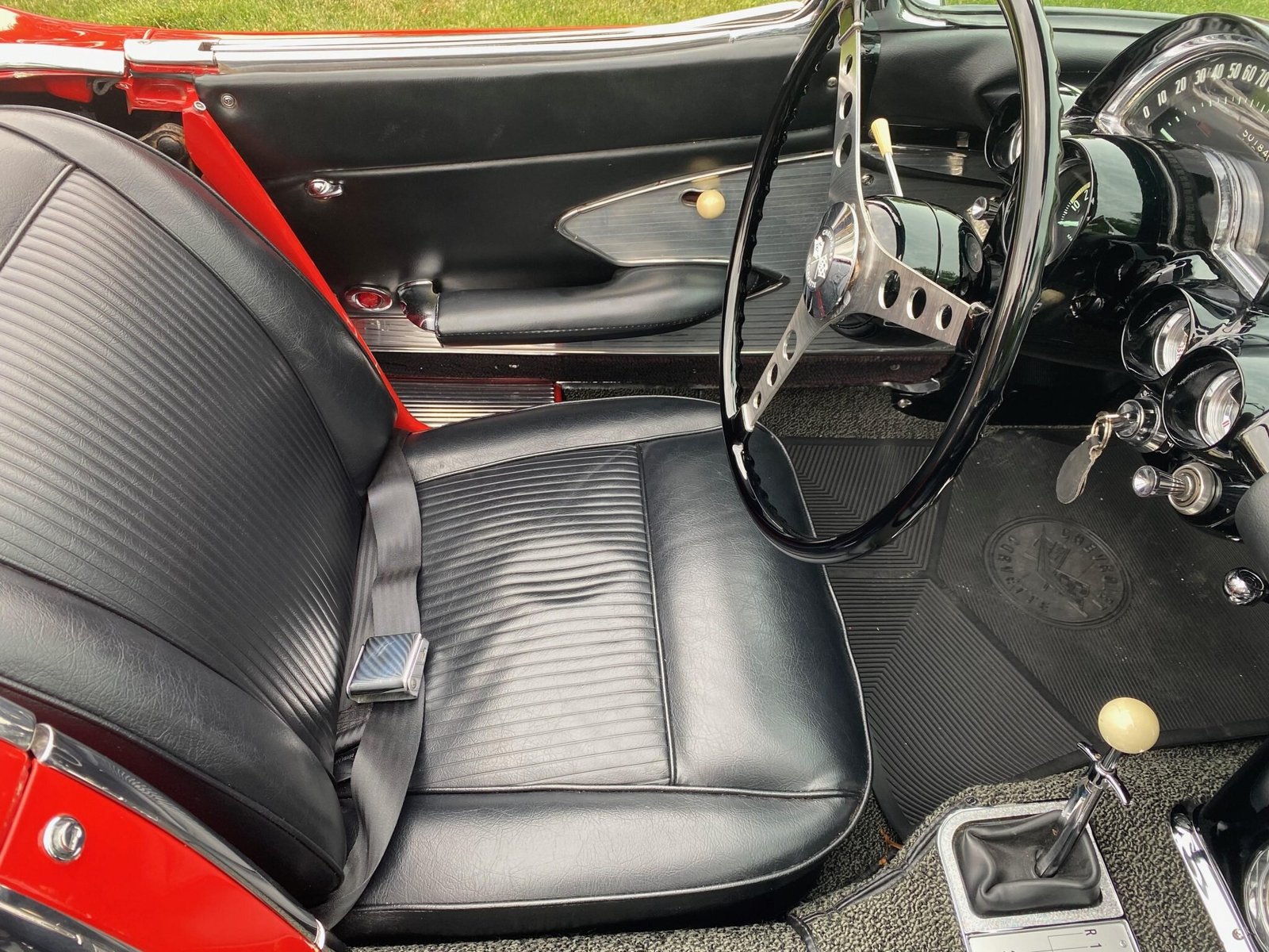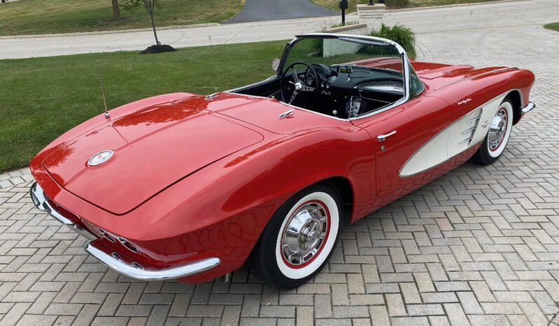 This 1961 Chevrolet Corvette is powered by a fuel-injected 283ci V8 paired with a four-speed manual transmission and is finished in red with white coves over black vinyl. Equipment includes a white soft top, 15″ steel wheels, a heater, and an AM/FM cassette stereo.